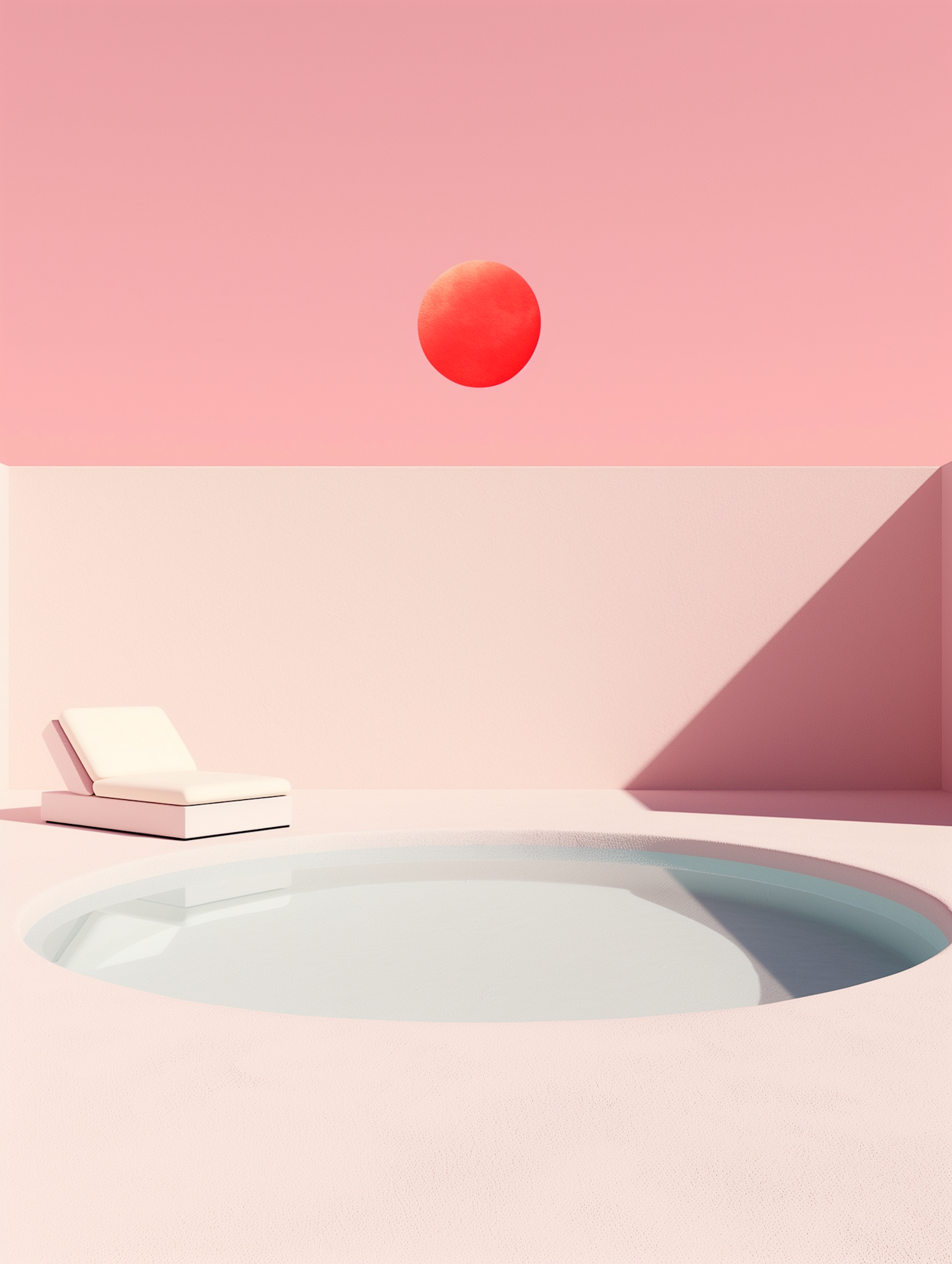 Minimalist scene with a pink palette, featuring a circular pool, white lounge chair, and a bold red sun against a pastel backdrop.