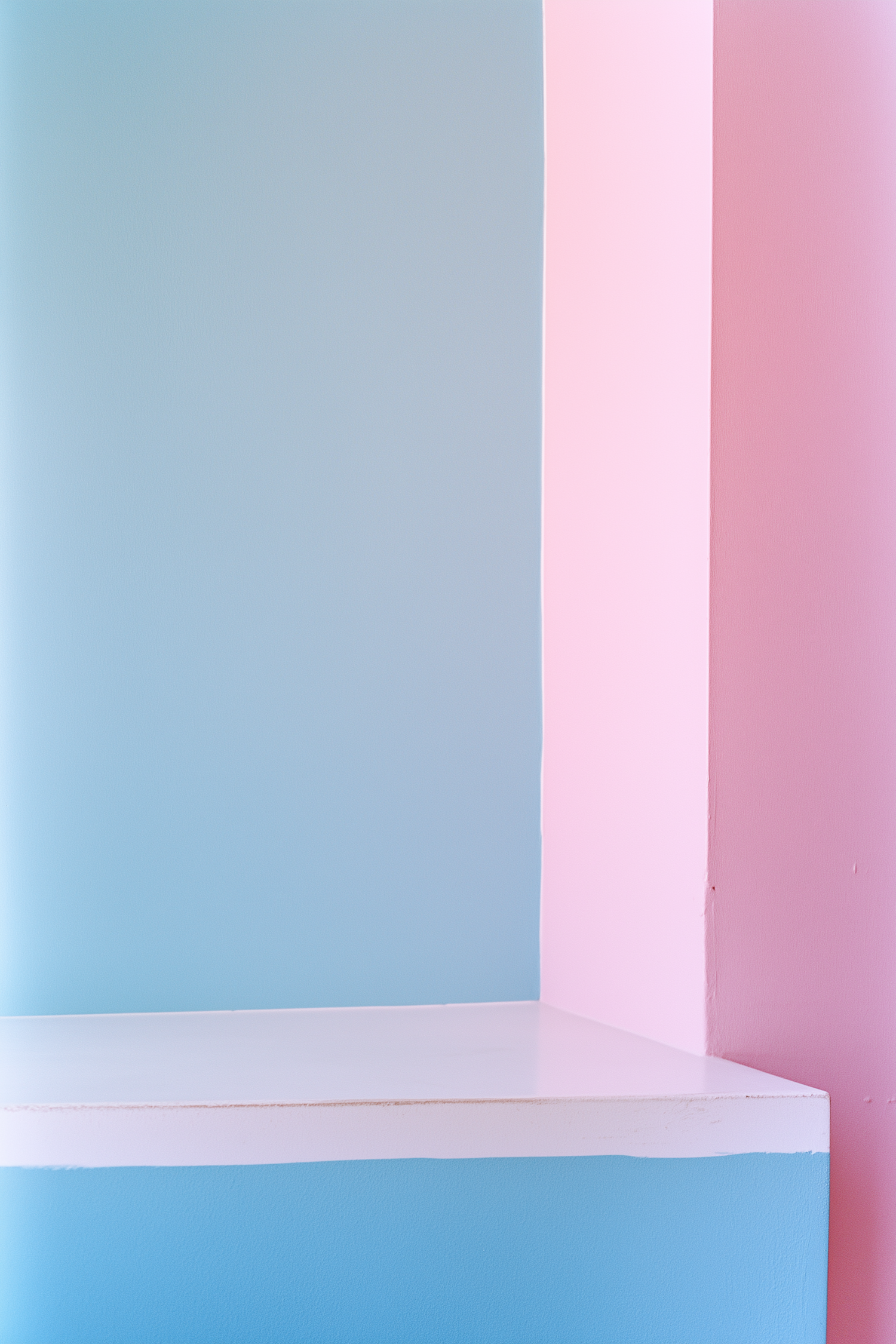 Minimalist pastel interior with soft blue and pink walls, intersected by a white shelf. Clean lines and soothing colors create a modern vibe.