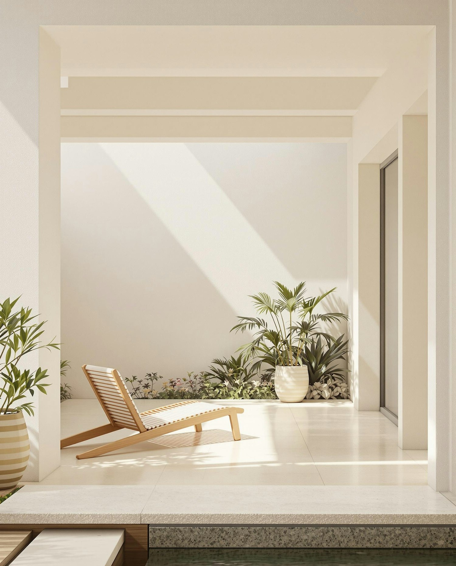Minimalist patio with a wooden lounge chair, potted plants, and a small pool, bathed in sunlight for a serene and modern outdoor vibe.