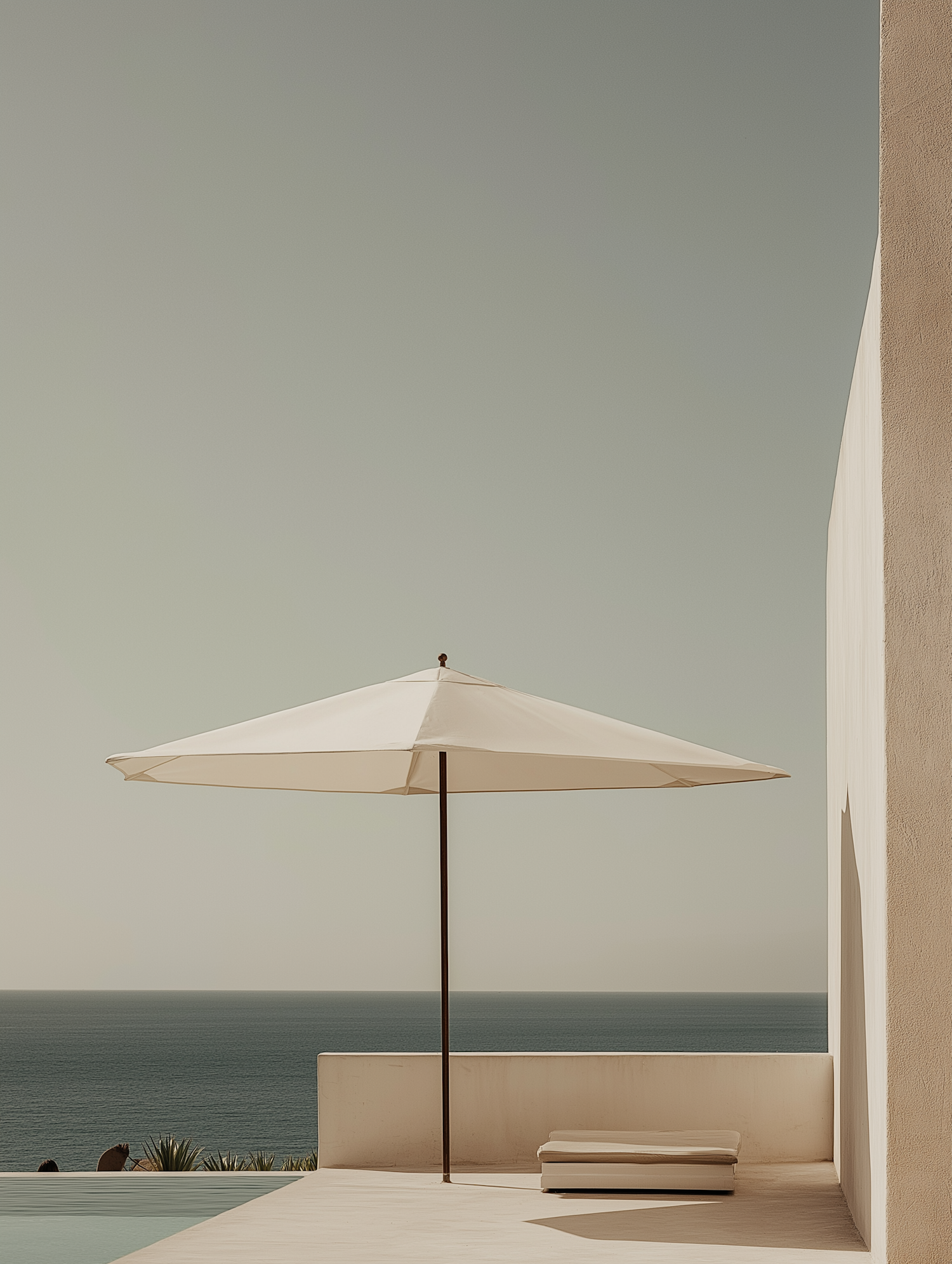 Minimalist patio with a white umbrella, lounge chair, and ocean view under a hazy sky. Perfect for relaxation and modern design lovers.