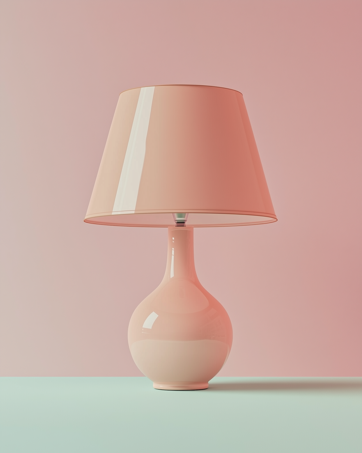 Minimalist peach table lamp with a glossy ceramic base, pastel pink background, and mint-green surface for a modern aesthetic.