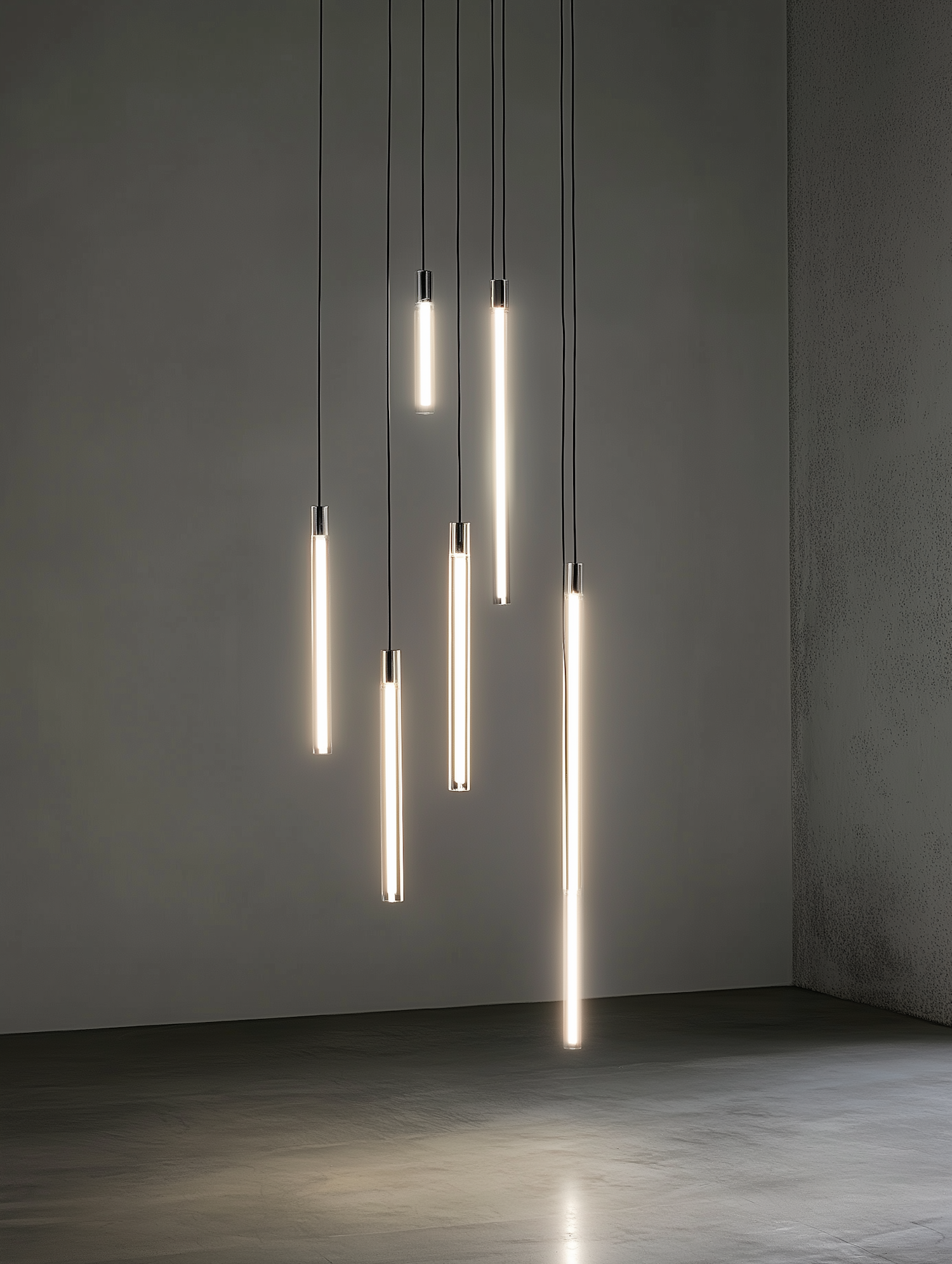 Modern pendant lights with sleek cylindrical designs hang in a dimly lit room, creating a minimalist and elegant ambiance.