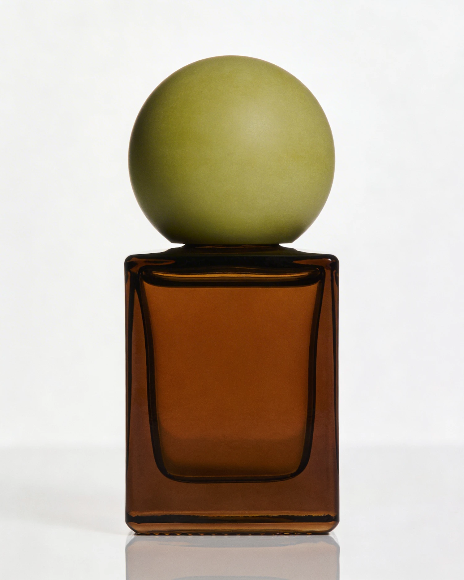 Amber glass perfume bottle with a green spherical cap, showcasing a minimalist and elegant design on a white background.