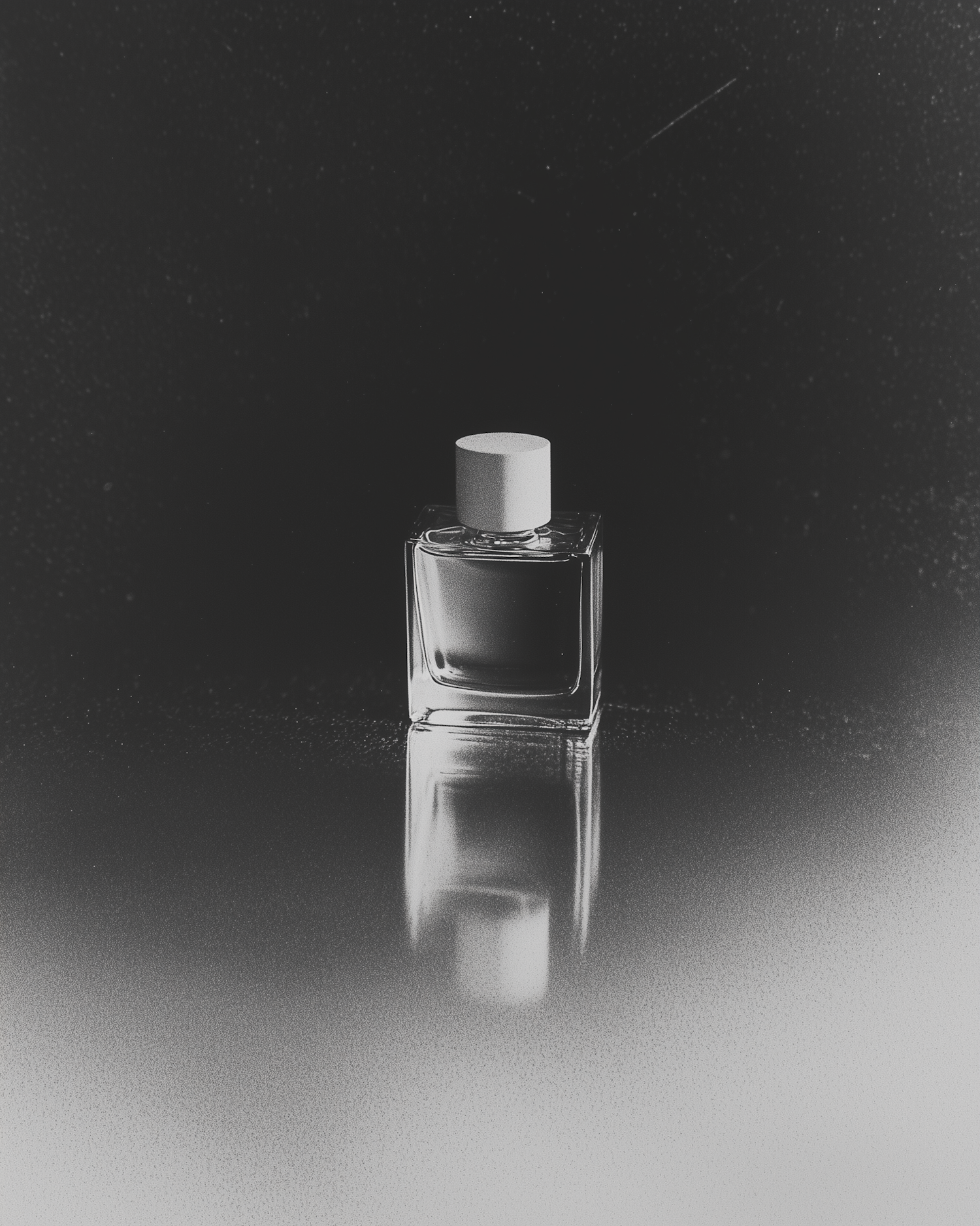 Minimalist black-and-white photo of a square glass perfume bottle with a reflective surface and dark textured background.