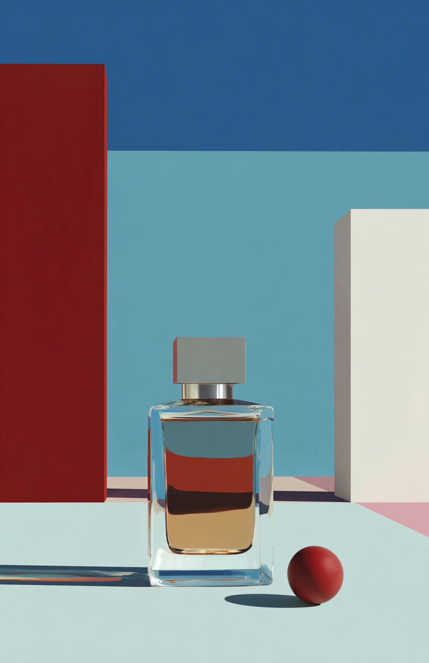 A minimalist arrangement of a perfume bottle, geometric shapes, and bold colors, creating a striking and modern visual aesthetic.