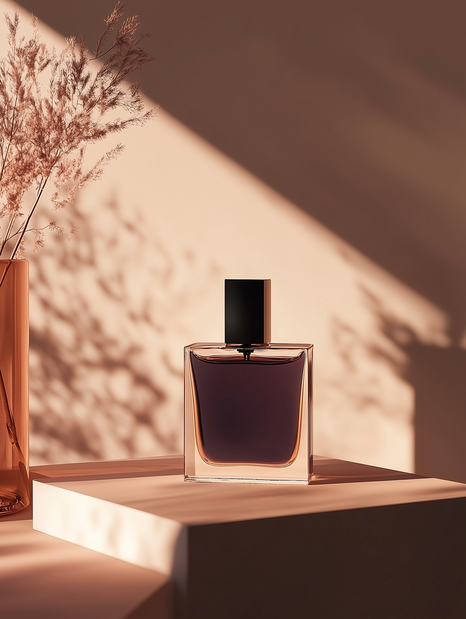 Minimalist perfume bottle with black cap on a beige pedestal, warm sunlight, and pampas grass in a vase for a modern aesthetic.