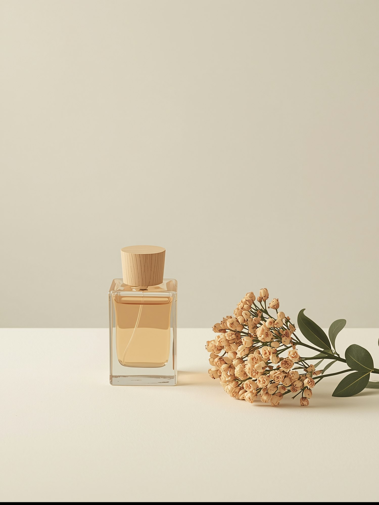 Minimalist perfume bottle with wooden cap and dried flowers on a beige background, exuding natural elegance and simplicity.