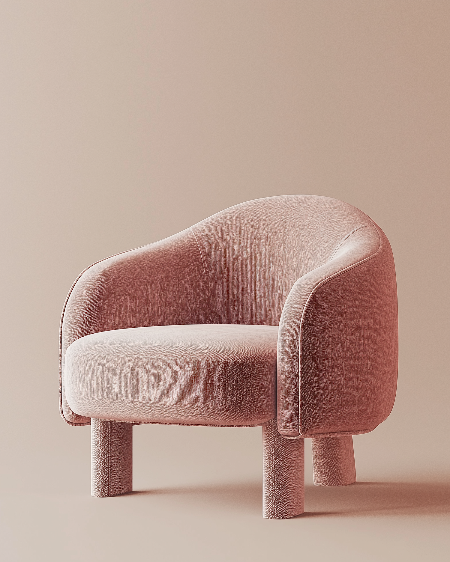 Minimalist pink armchair with rounded design and textured fabric, perfect for modern interiors. Set against a neutral beige background.