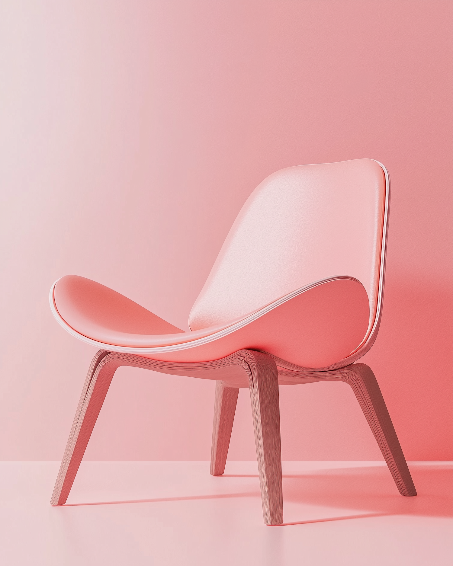 Sleek pink modern chair with curved seat and wooden legs, set against a monochromatic pink background for a minimalist aesthetic.
