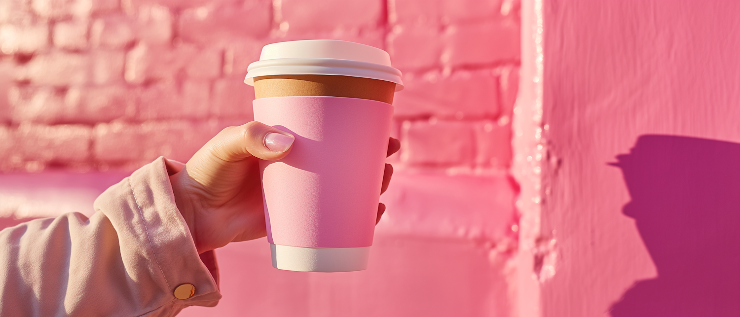 Hand holding a coffee cup with pink sleeve against a pink brick wall, creating a vibrant and colorful scene.