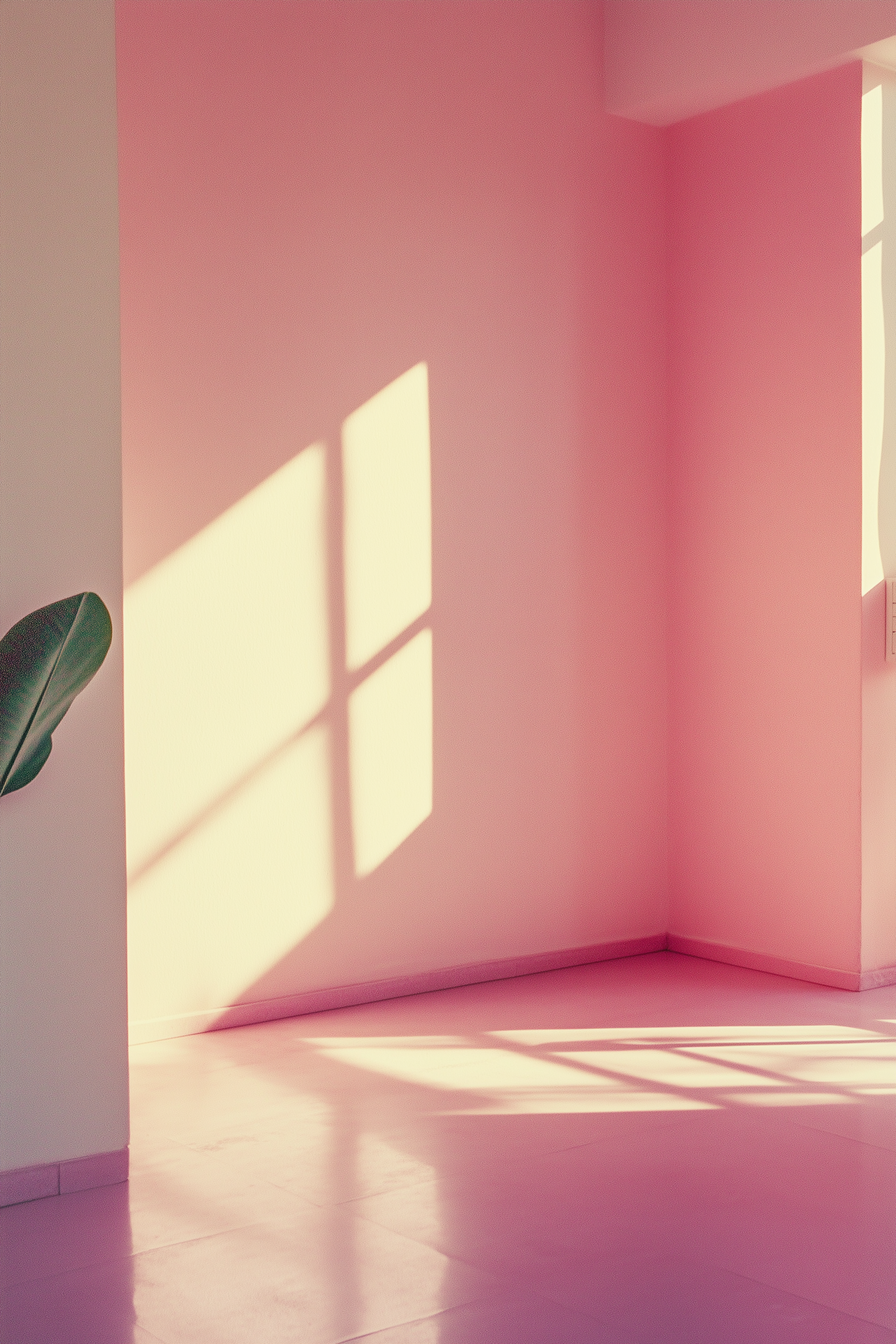 Minimalist pink interior with sunlight casting geometric shadows, soft hues, and a green plant leaf adding contrast.