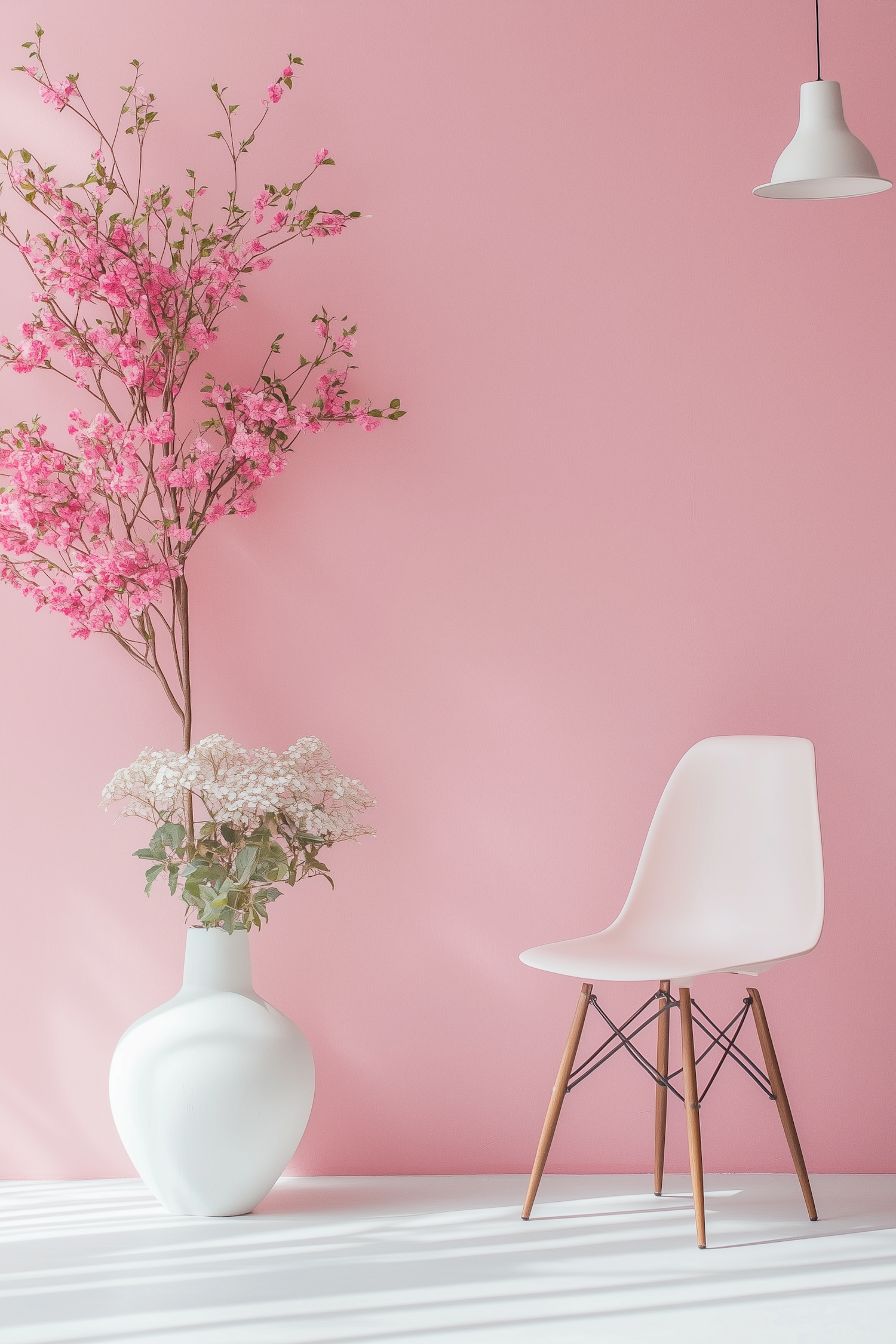 Minimalist pink-themed interior with a white chair, cherry blossoms in a vase, and a pendant lamp for a serene, modern aesthetic.