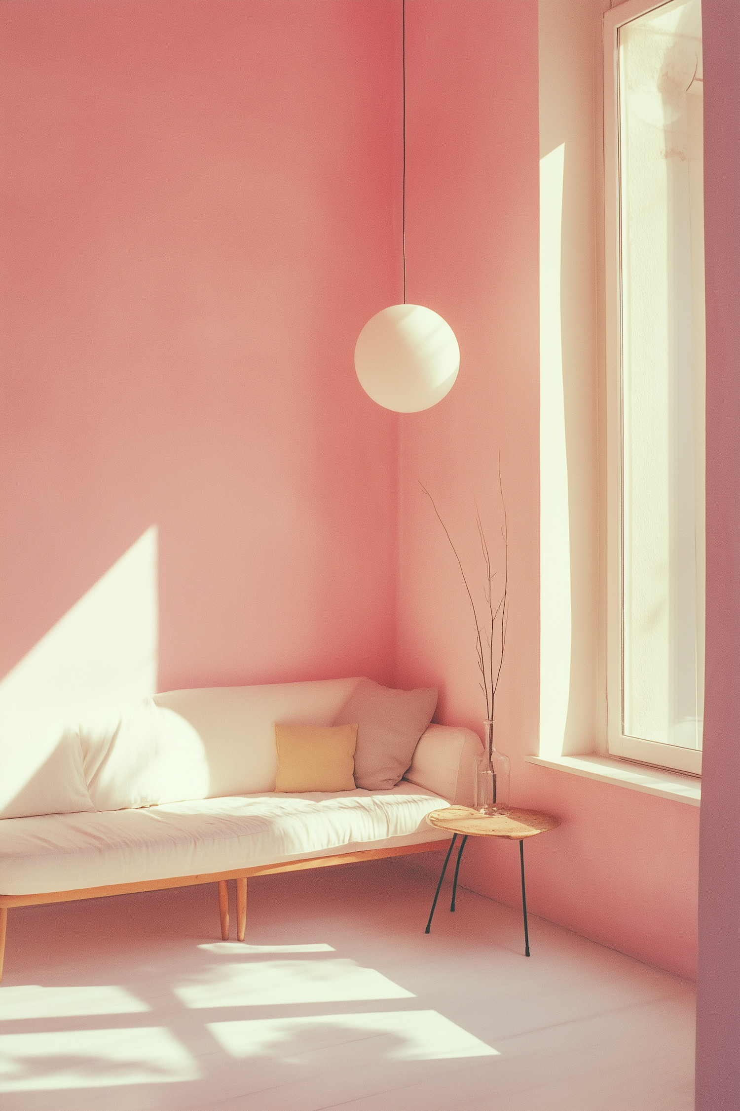 Minimalist pink room with a white sofa, pastel cushions, wooden side table, and natural light streaming through a large window.