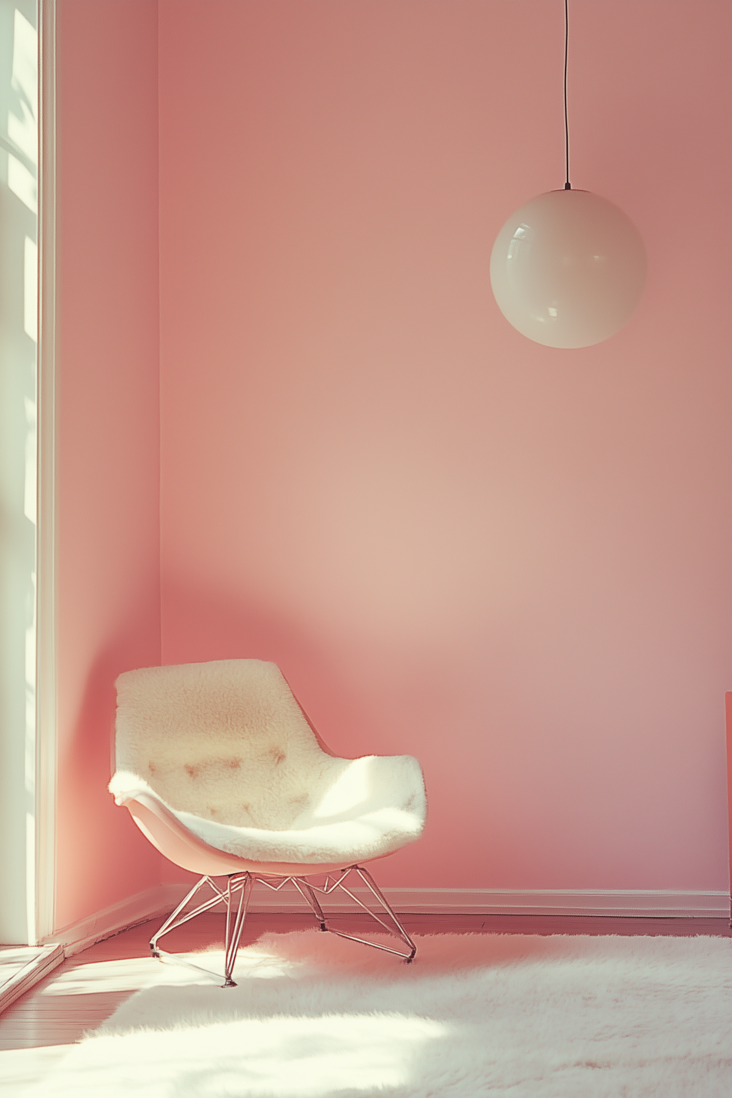 Minimalist pink room with a fluffy white chair, plush rug, and a spherical pendant light, creating a cozy and modern aesthetic.