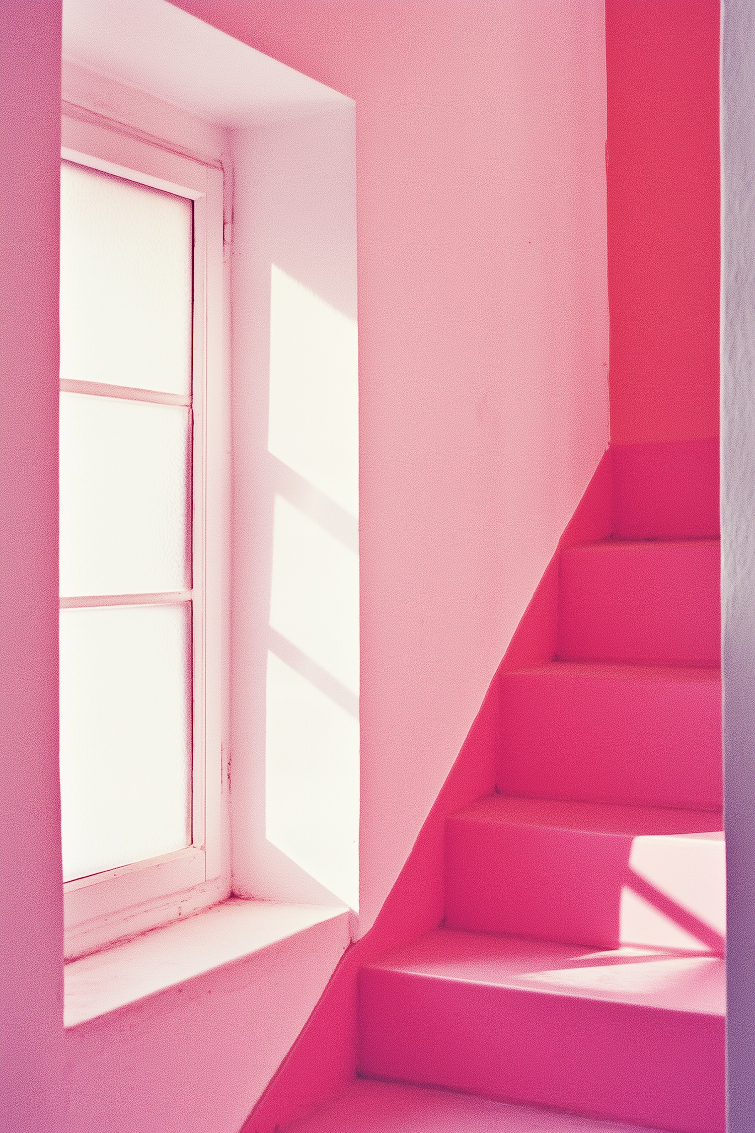 Minimalist pink staircase and window with natural light casting geometric shadows, creating a modern and vibrant aesthetic.