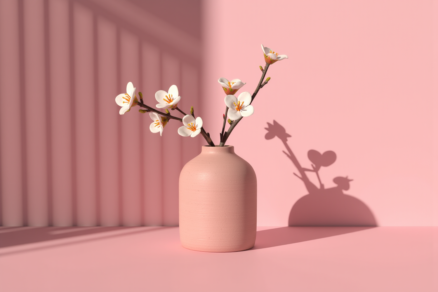 A pink ceramic vase with white flowers on a pink background, casting soft shadows. Perfect for minimalist and aesthetic decor inspiration.