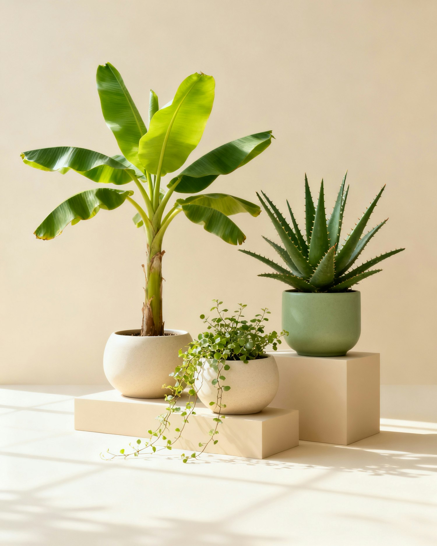 A banana tree, aloe vera, and trailing vine in minimalist pots on a beige background with soft natural light and geometric platforms.