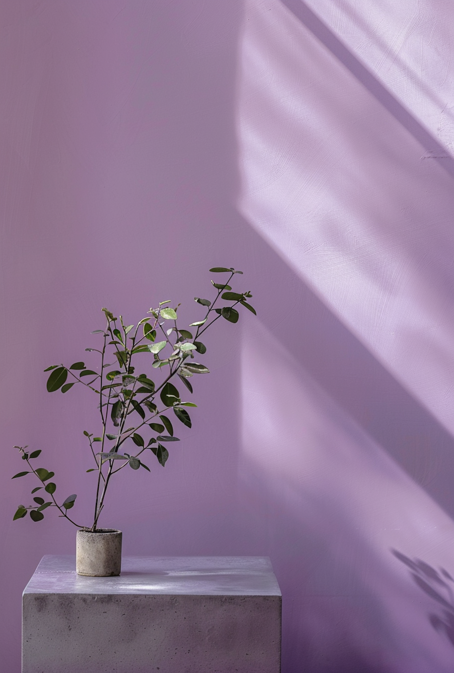 Minimalist potted plant on concrete pedestal against a lavender wall with soft shadows, creating a serene and elegant atmosphere.