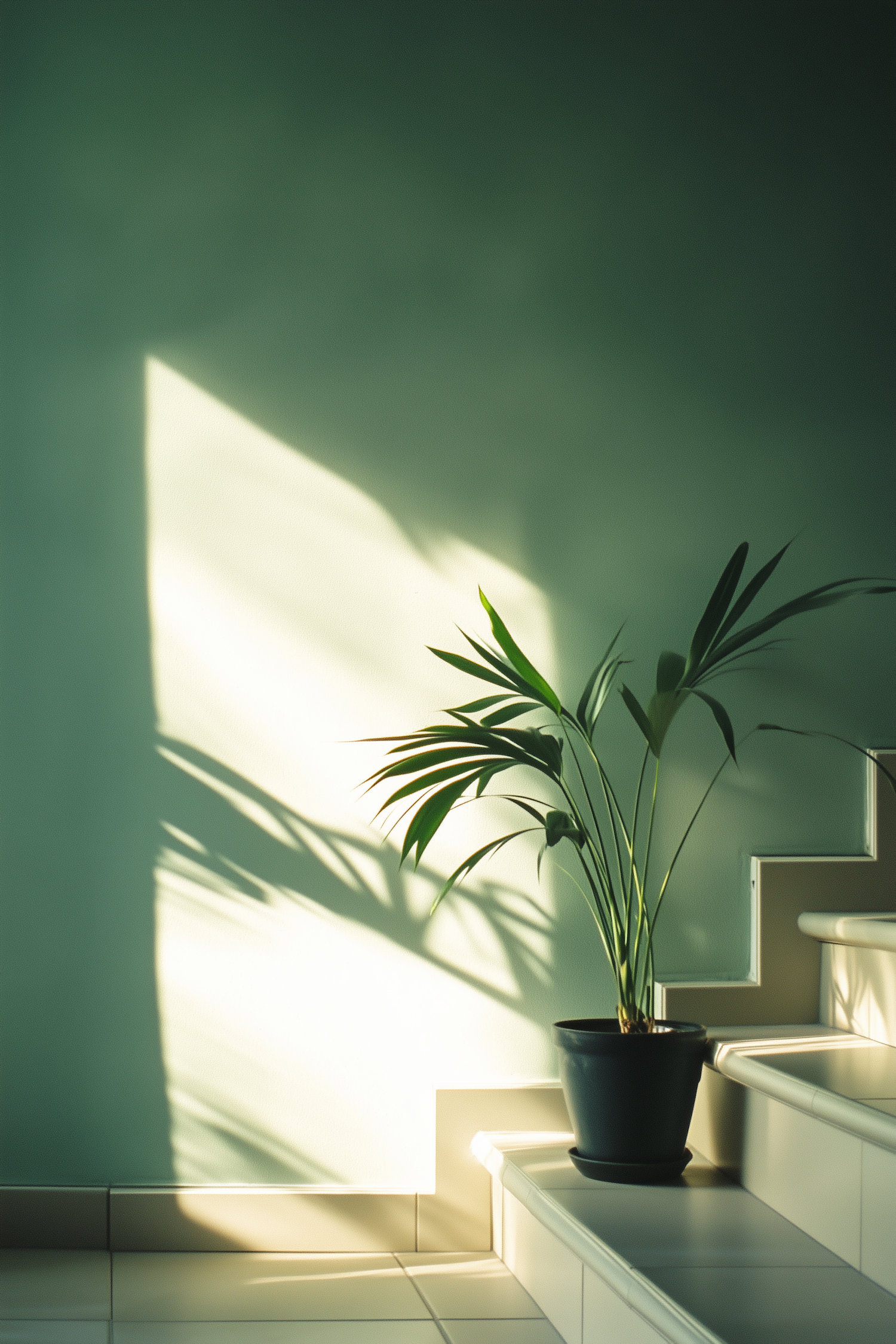 A potted green plant on a tiled staircase, with sunlight casting beautiful shadows on a light green wall. Minimalist and serene.