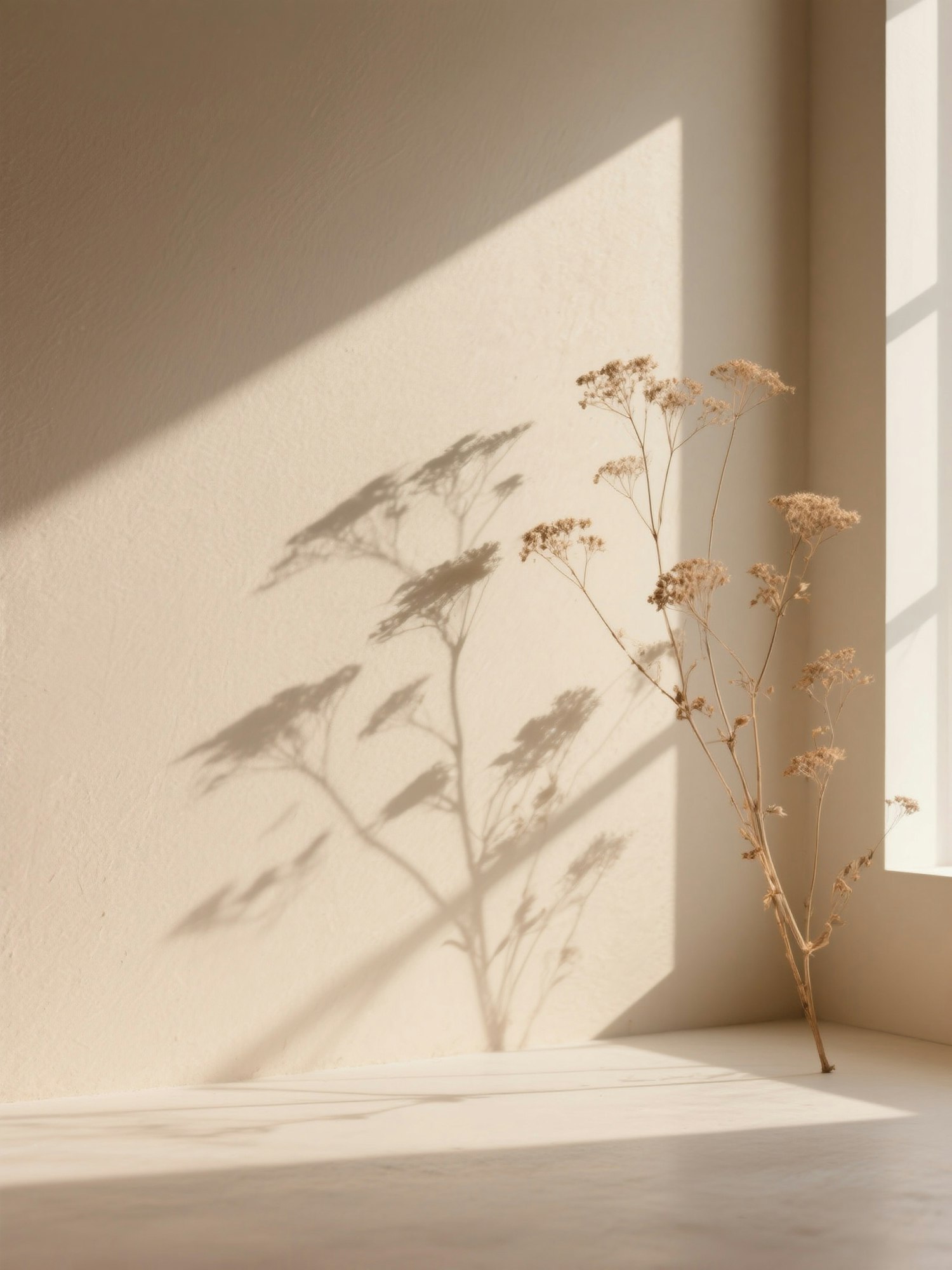 Minimalist dried plant casting soft shadows on a beige wall, illuminated by sunlight through a window. Serene and artistic composition.