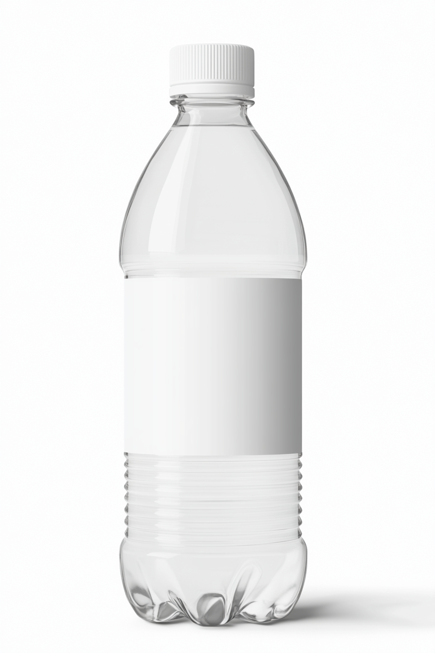 Clear plastic water bottle with a white cap and blank label, set against a plain white background.