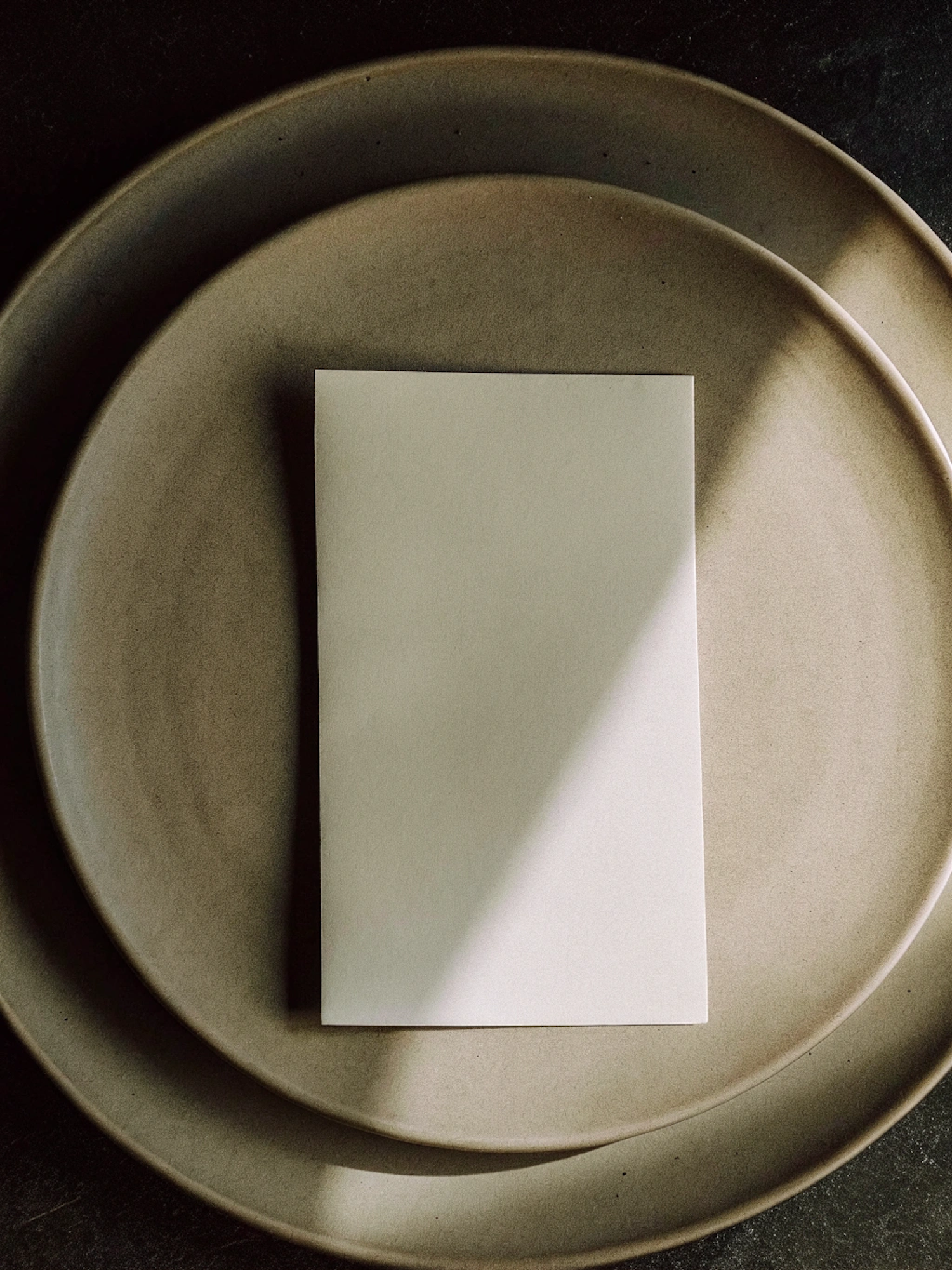 Minimalist design with a white card on beige ceramic plates, accented by soft lighting and a diagonal shadow for a modern aesthetic.