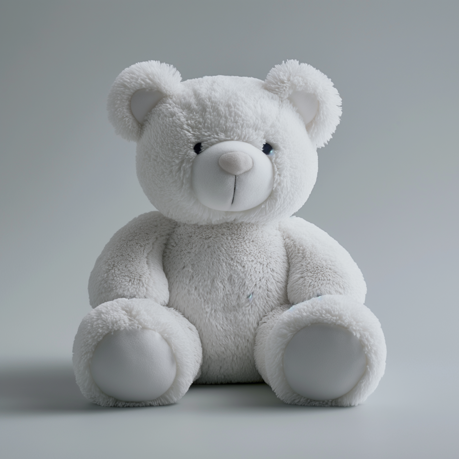 Soft white teddy bear with fluffy fur and gentle expression against a gray background, perfect for a cozy and inviting atmosphere.