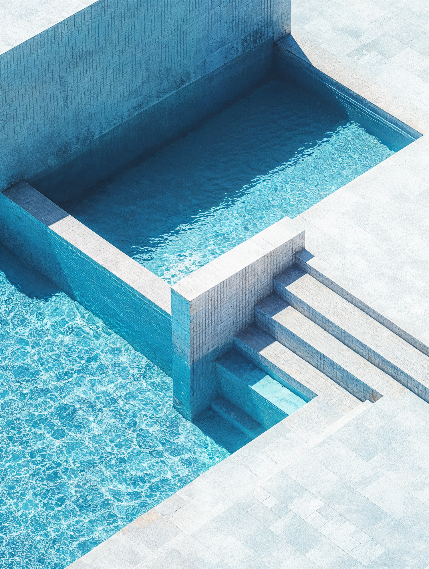 Minimalist swimming pool with geometric design, clear water, and tiled steps. A serene and modern outdoor space with clean lines.