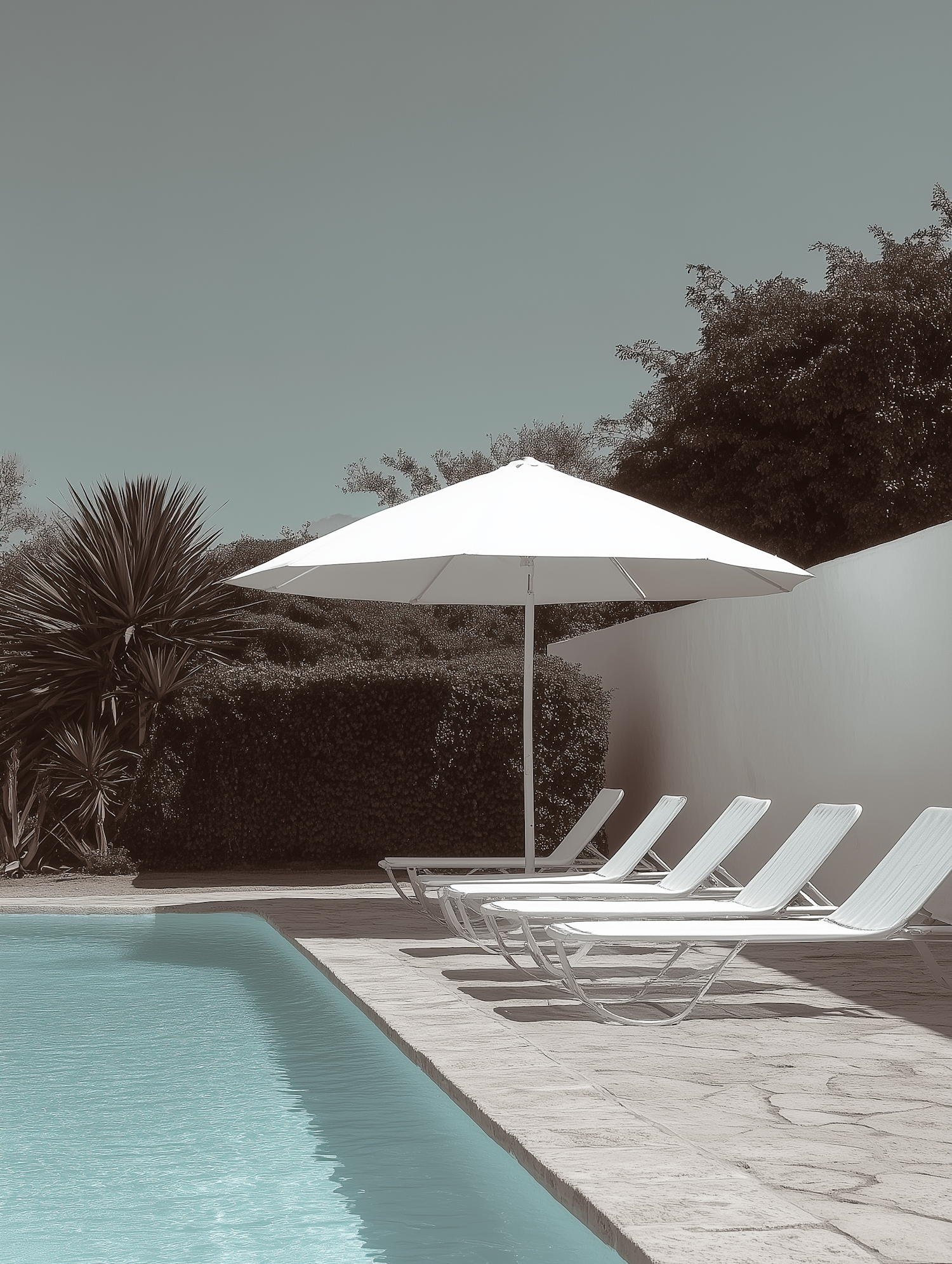 Minimalist poolside with white lounge chairs, umbrella, and lush greenery. Perfect for relaxation on a sunny day.