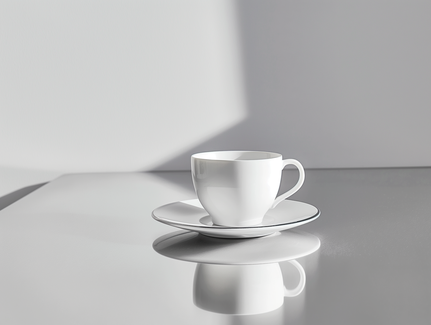 Minimalist white cup and saucer on a reflective surface with soft lighting and shadows, creating a serene and elegant composition.