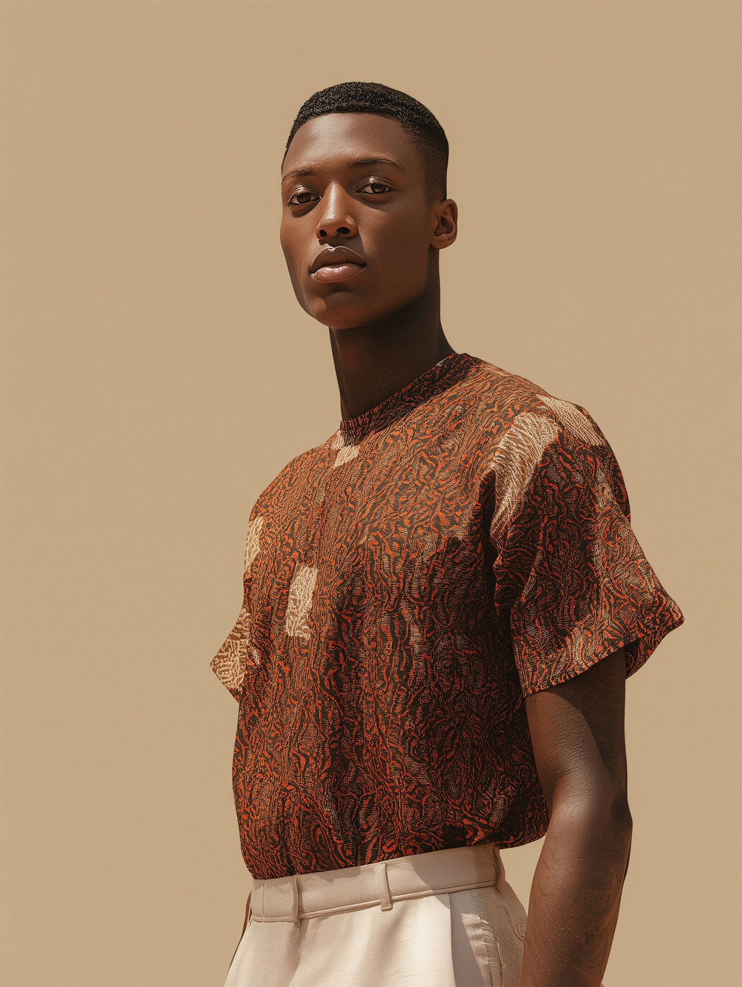 Stylish man in a patterned shirt and light trousers against a beige background, showcasing modern fashion with earthy tones.