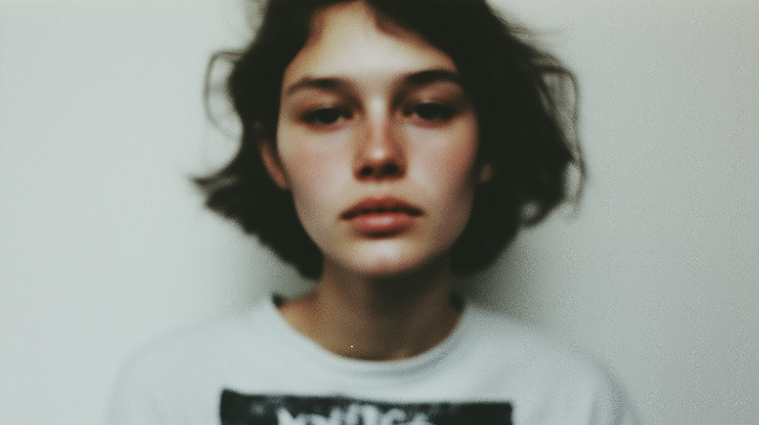 Close-up portrait of a young person with short dark hair, fair skin, and a neutral expression, wearing a white shirt with a graphic design.