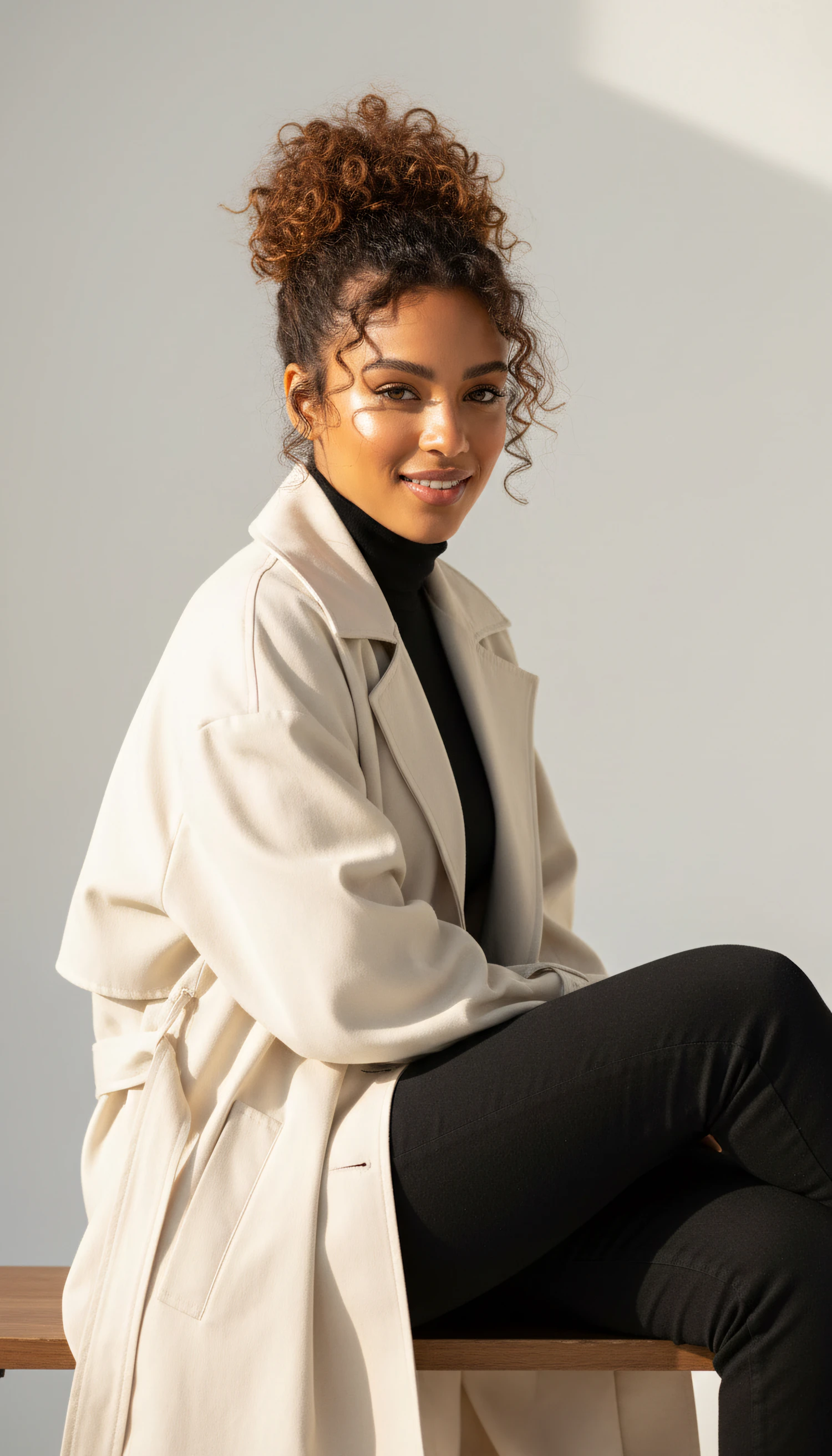 A stylish woman in a beige trench coat and black turtleneck sits on a bench, exuding elegance in soft natural lighting.