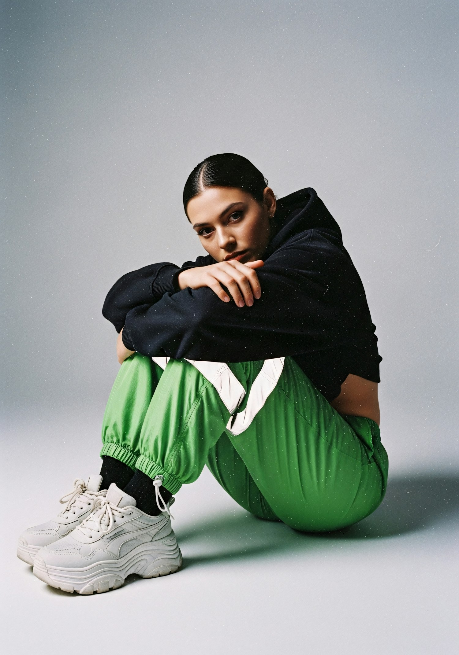 A person in a black hoodie and green pants sits on the ground, gazing at the camera with a calm expression, in a minimalistic setting.