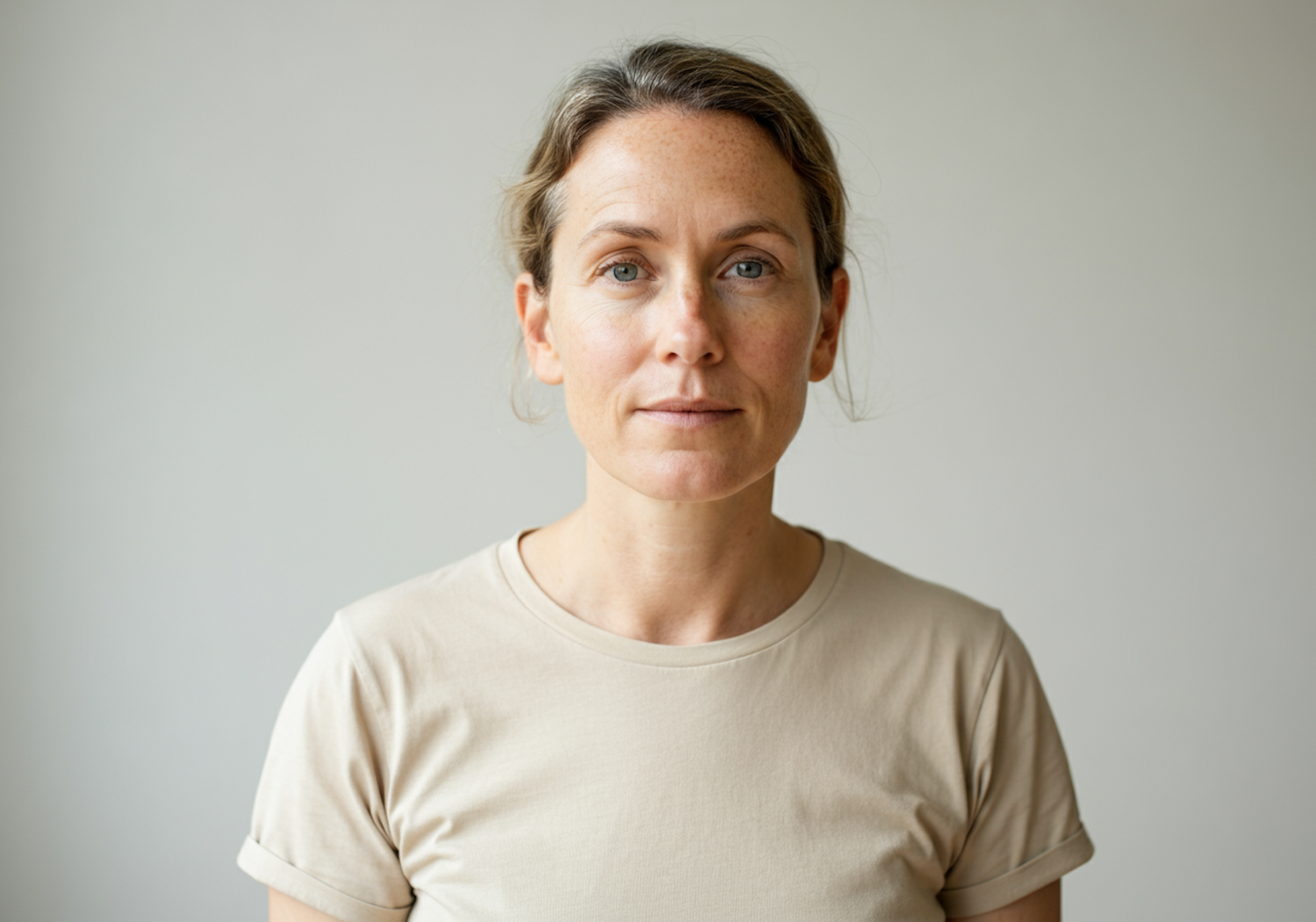 A woman with light brown hair and blue eyes in a beige t-shirt, standing against a plain gray background with a neutral expression. Professional neutral portrait photo for profile or avatar use .clean, neutral office avatar photo with natural light and simple background.