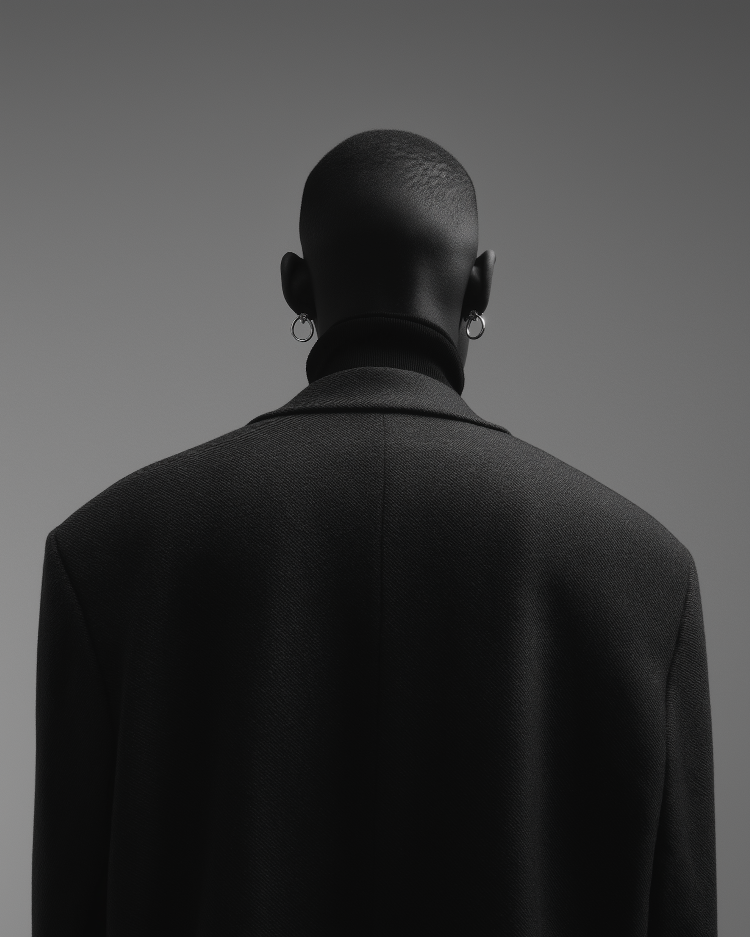 Minimalist image of a person from behind wearing a textured dark jacket and hoop earrings, captured against a gradient gray background.