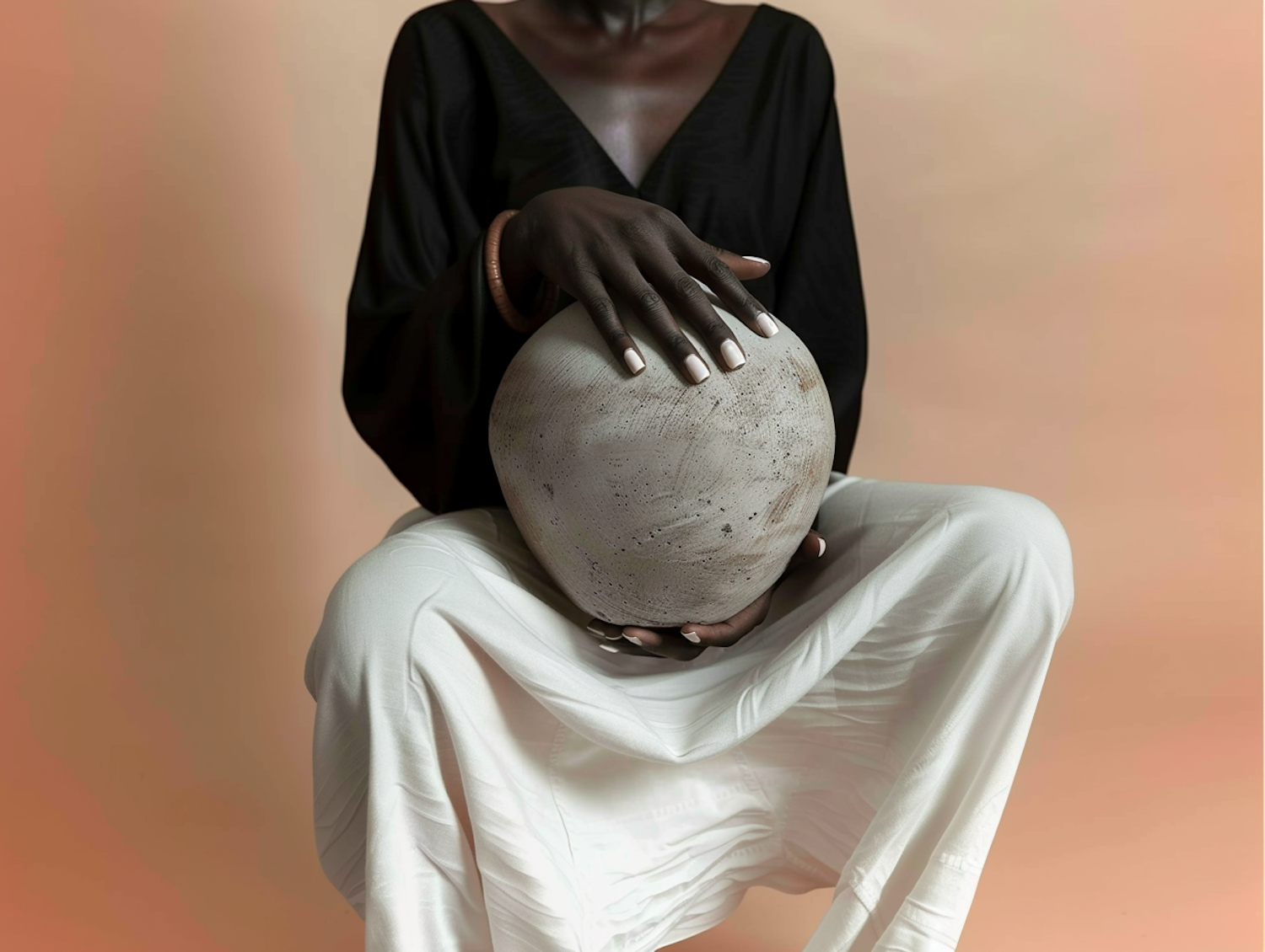 Minimalist portrait of a person holding a textured stone sphere, wearing black and white, set against a soft peach gradient background.