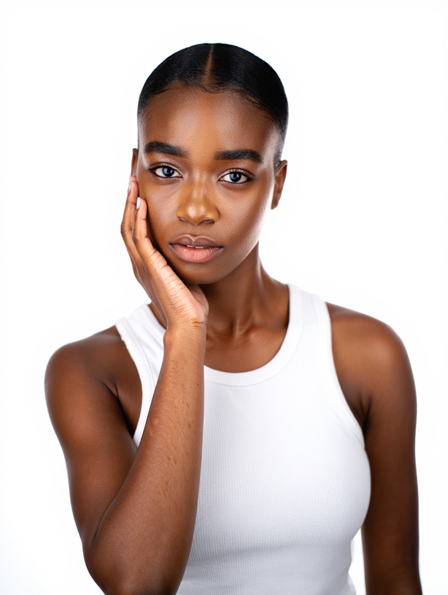 Portrait of a young Black woman with sleek hair, natural makeup, and a white top against a bright white background.