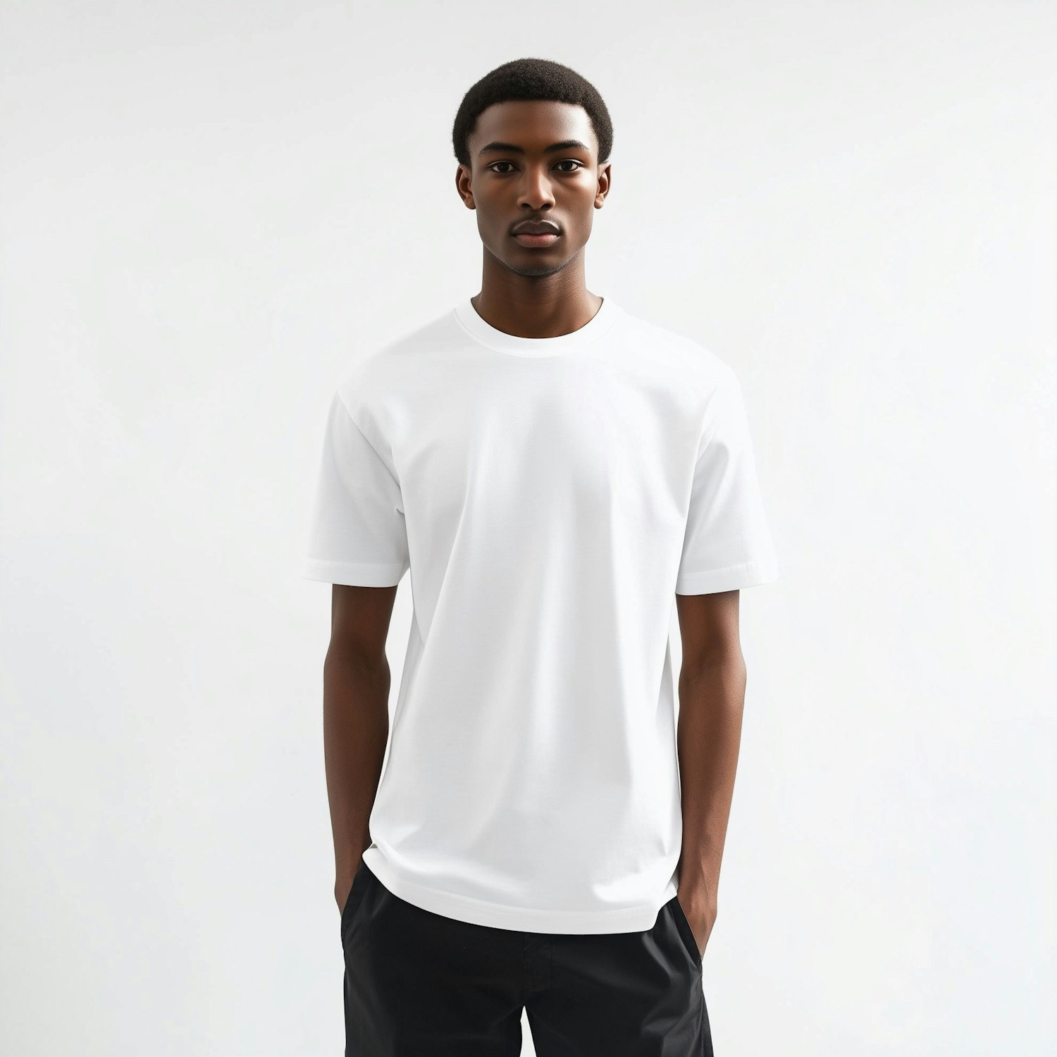 Minimalist portrait of a young man in a white T-shirt and black pants, standing against a plain white background.
