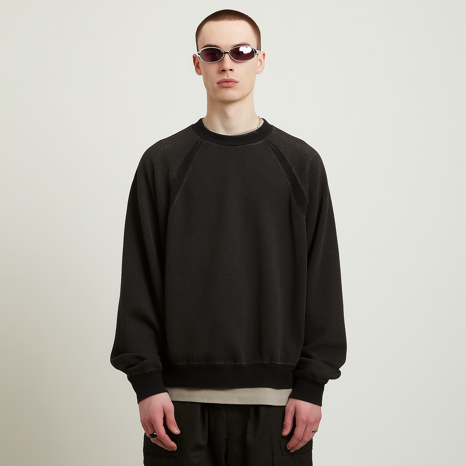A person in a black sweatshirt and sunglasses stands against a plain background, showcasing a minimalistic and modern style.