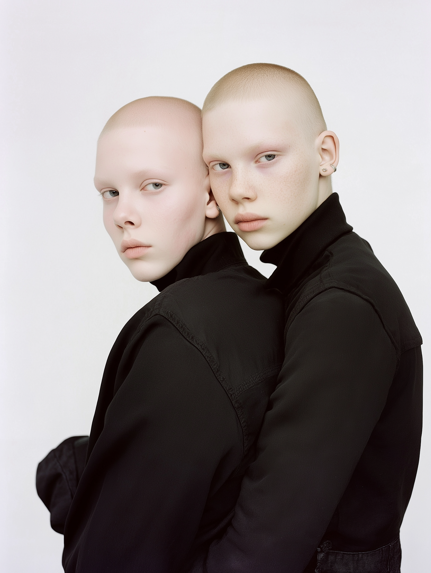 Two individuals with shaved heads and light skin in black attire, standing closely against a white background, exuding a minimalist aesthetic.