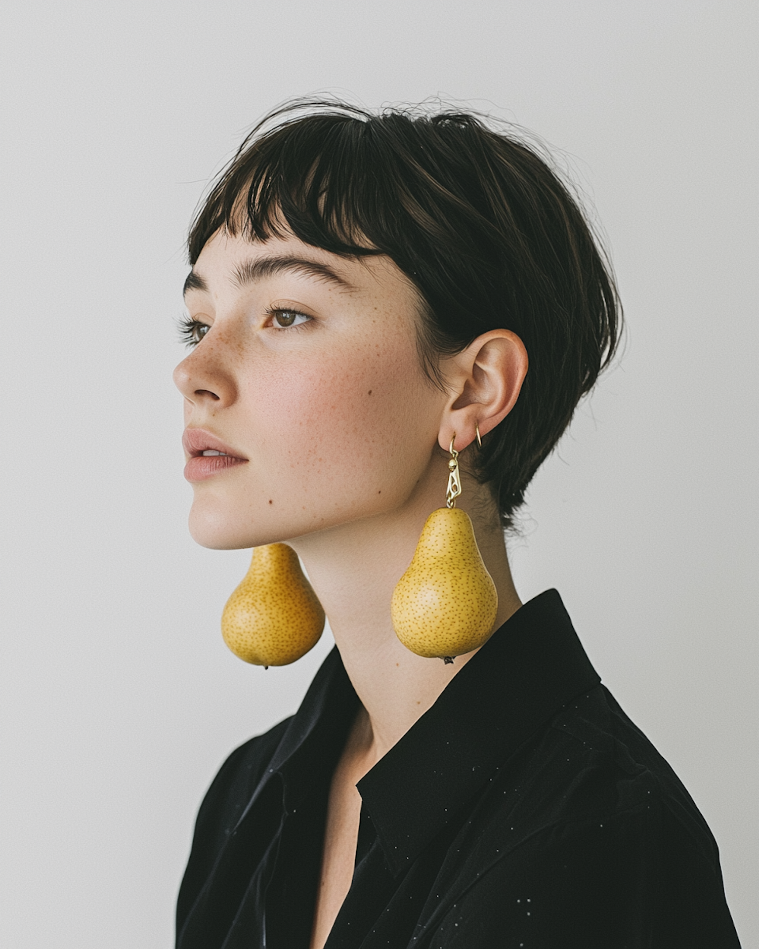 Minimalist portrait of a woman with short hair wearing quirky pear-shaped earrings, set against a light background.