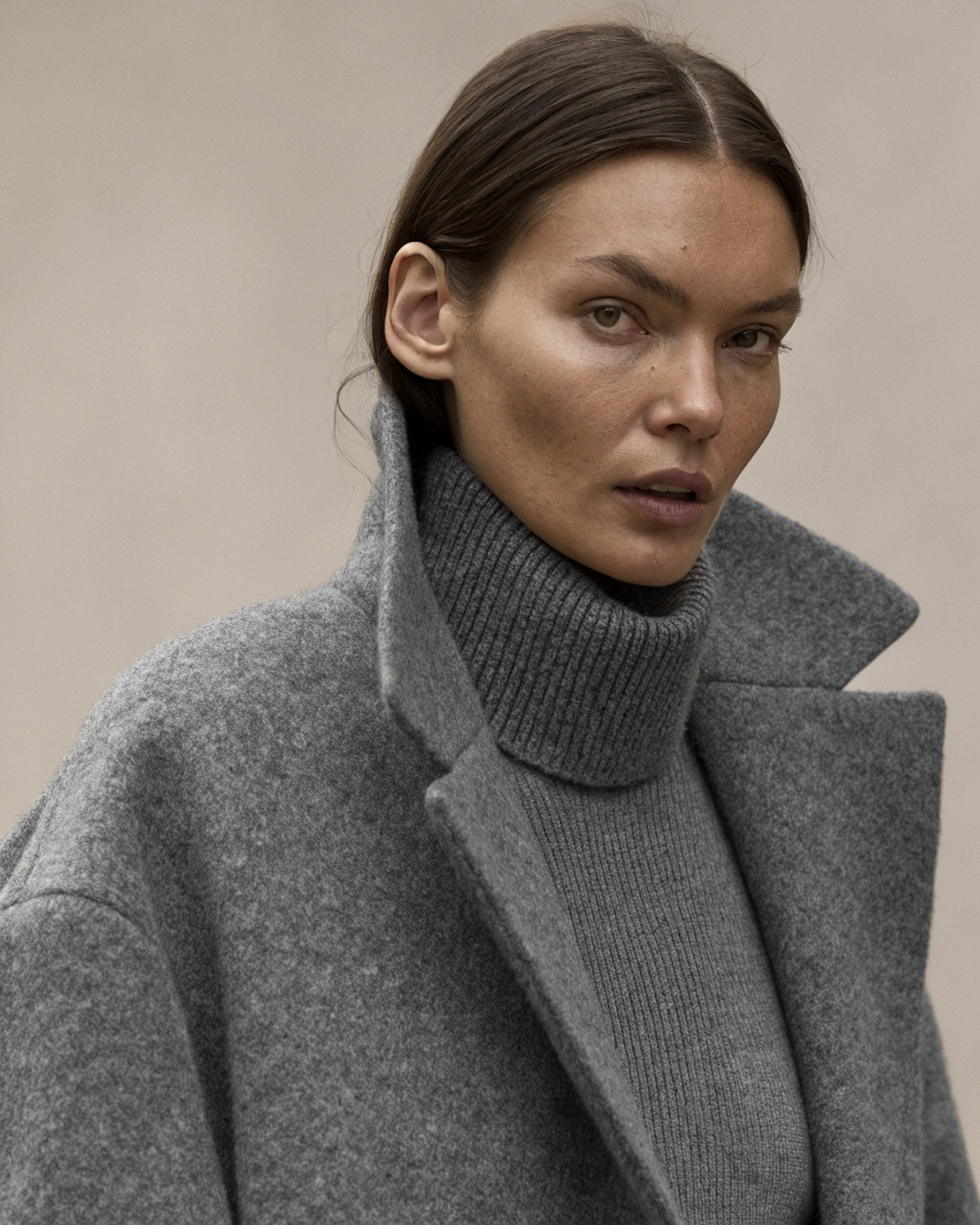 A woman in a gray wool coat and turtleneck sweater with a minimalist beige background, showcasing a chic and sophisticated winter look.