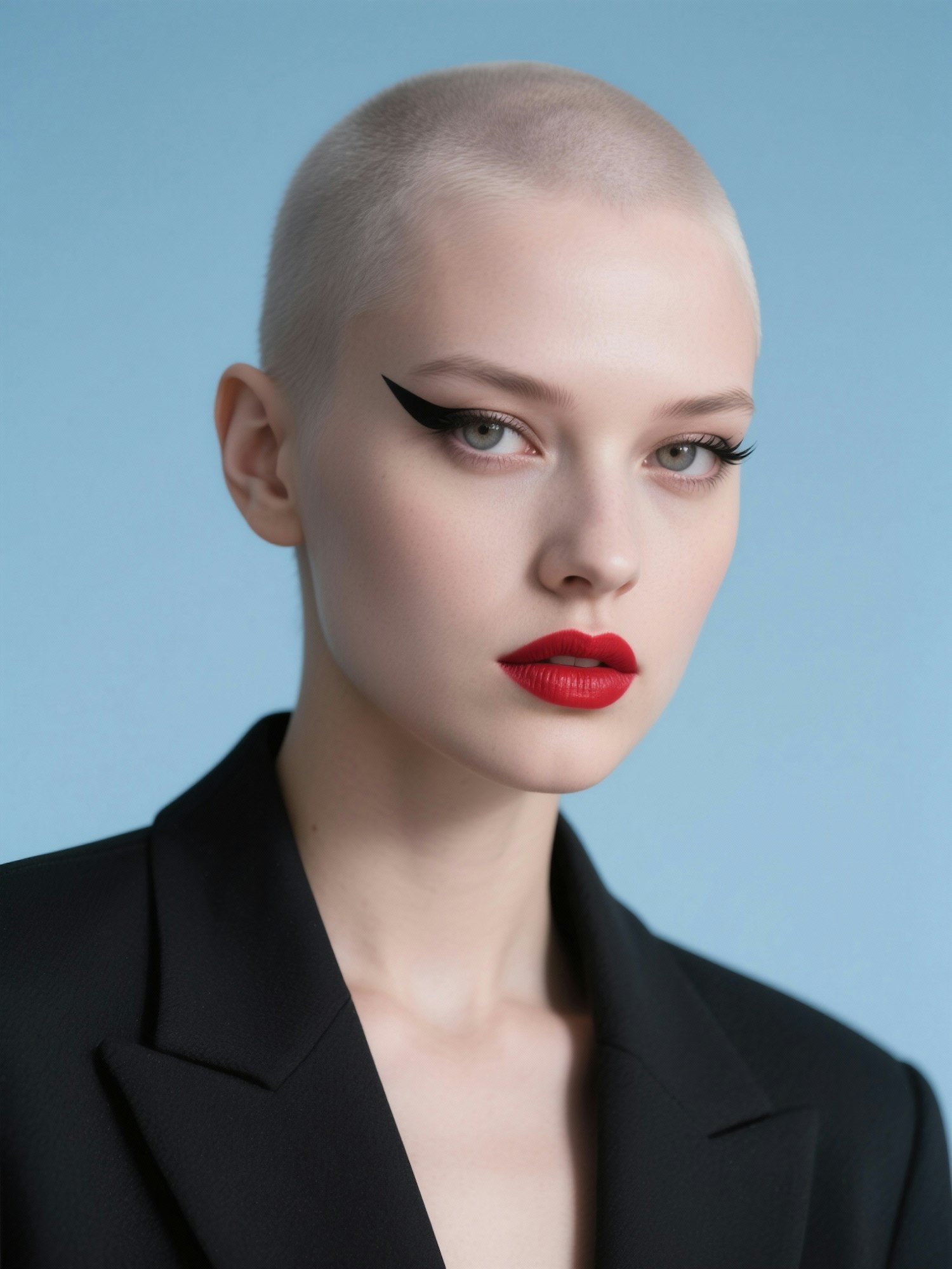 An ultra-realistic, photorealistic, and highly detailed ultra close-up portrait, frontal view, of a female model with a shaved head, very pale skin, bold red lipstick, and dramatic black winged eyeliner. She is wearing a sharp black blazer and is posed against a solid, light blue background. The image should be in sharp focus with professional studio lighting, showcasing every detail. High definition, 8K, high contrast