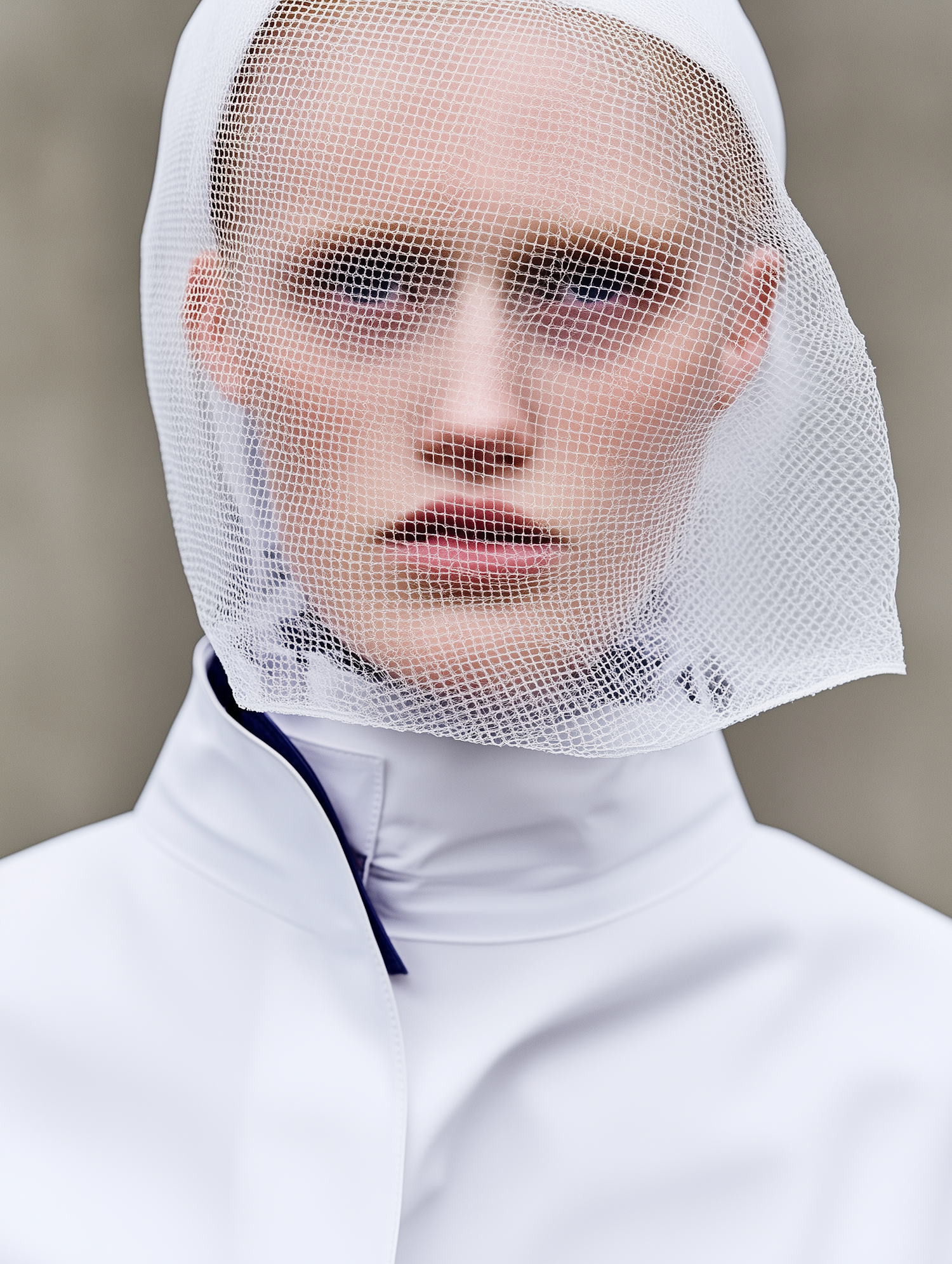 Close-up of a person with pale skin wearing a white high-collared outfit and mesh fabric over their face, creating a modern, minimalist vibe.