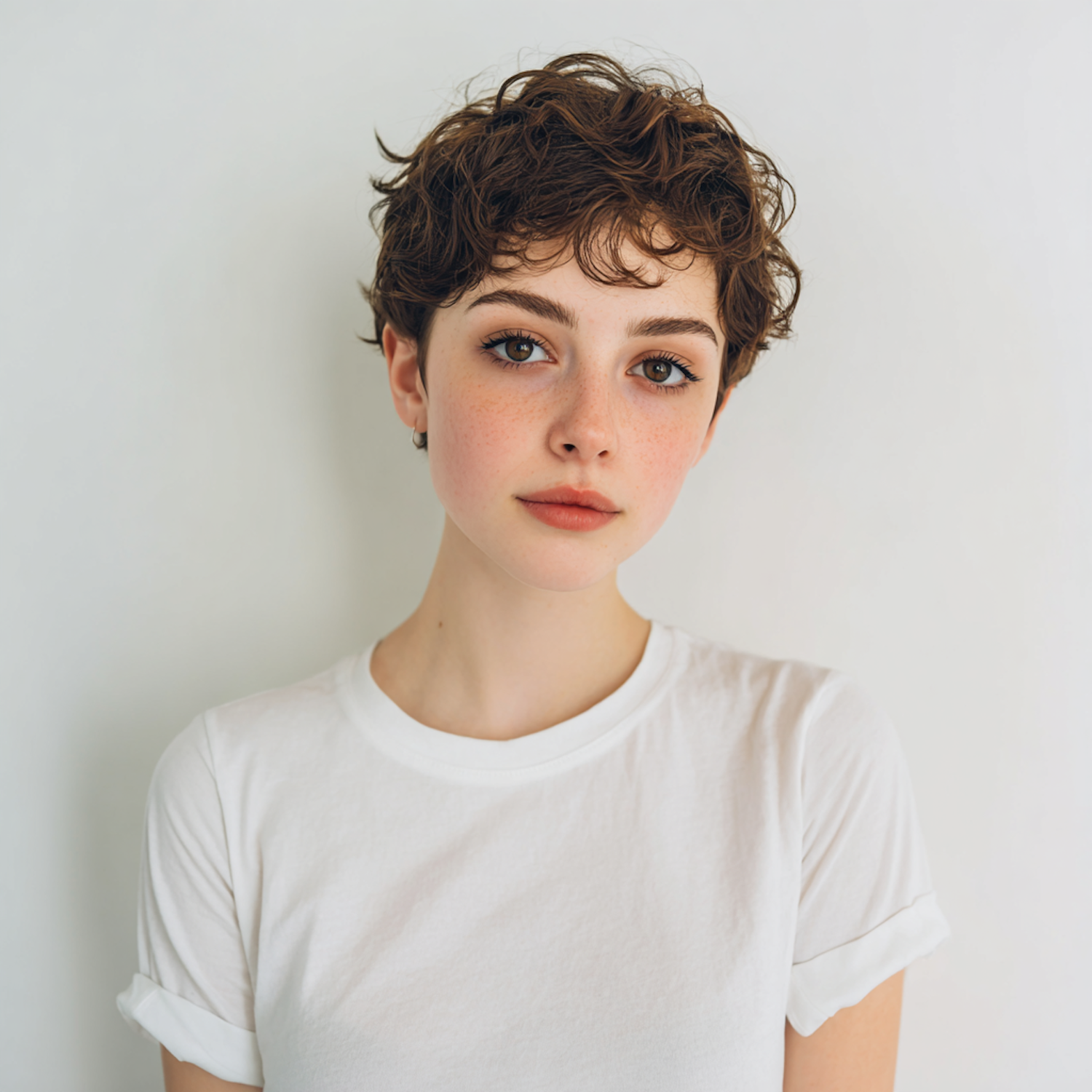 Portrait of a young person with short curly hair and a white t-shirt, set against a plain white background.