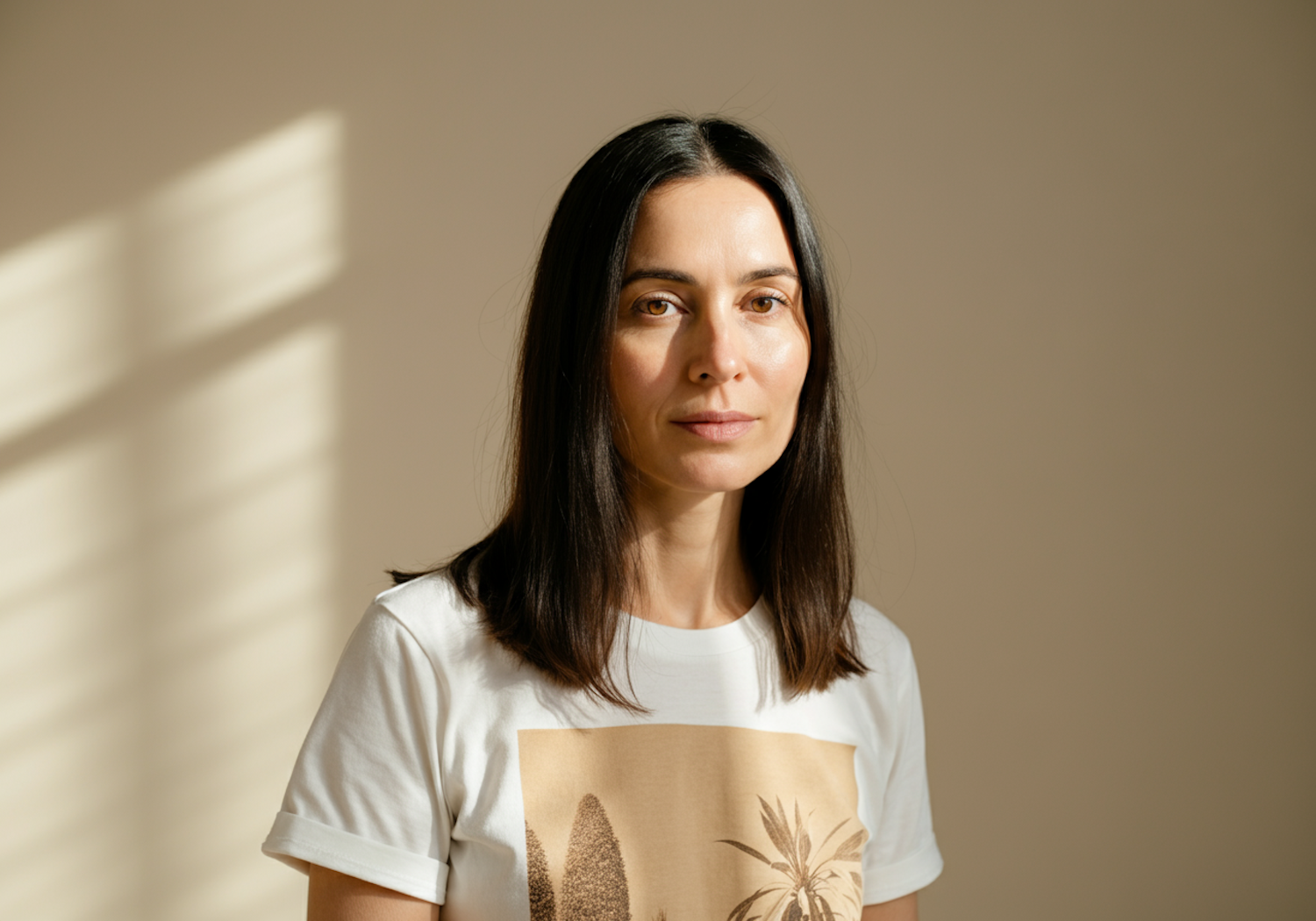A woman with dark brown hair and a white graphic t-shirt stands against a beige background in soft natural light.