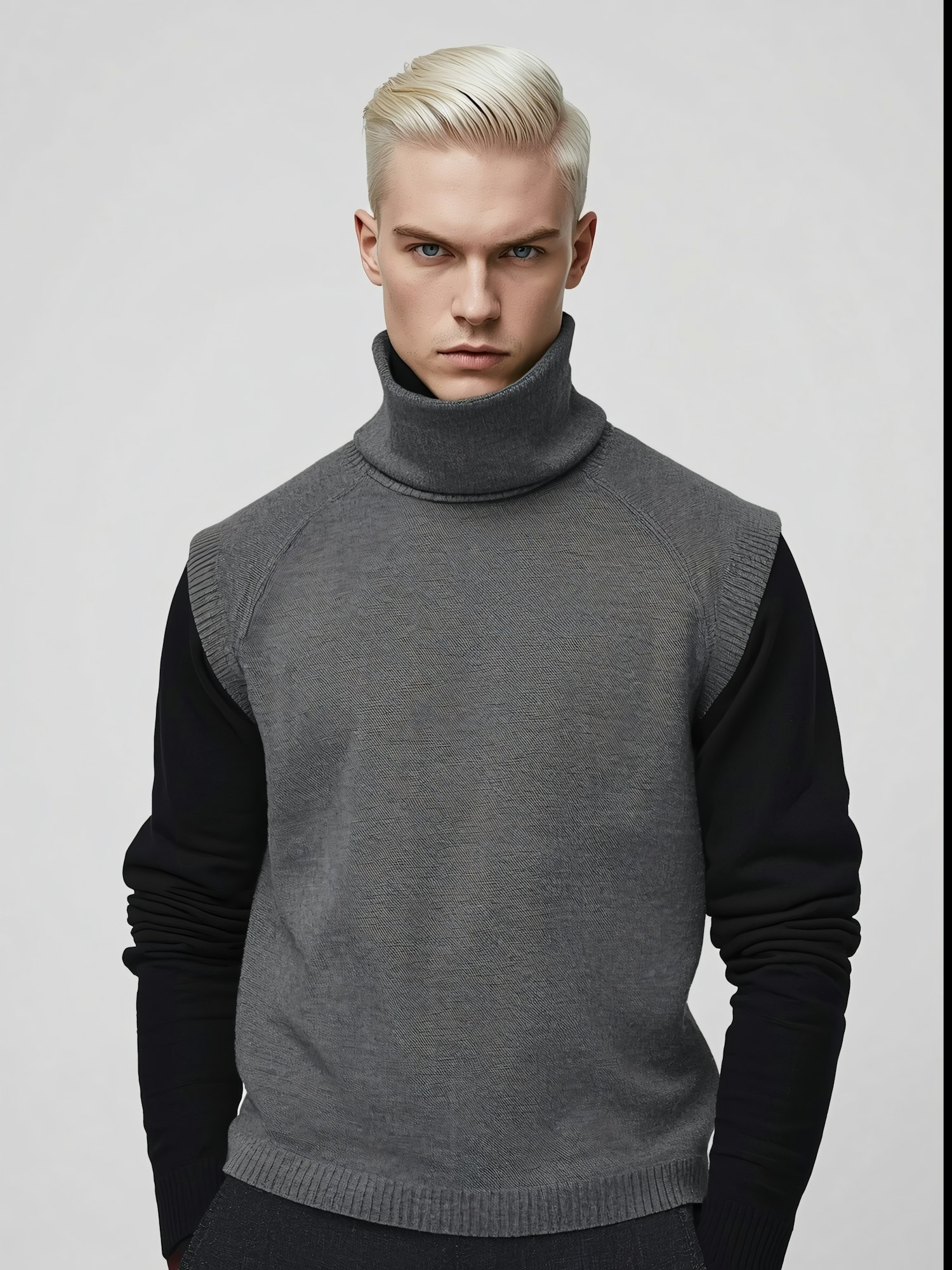 Stylish man with platinum blonde hair in a gray turtleneck and black sleeves, posing against a light background with a serious expression.