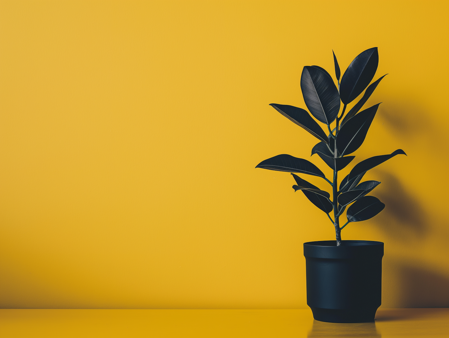 Minimalist potted plant with dark green leaves against a vibrant yellow background, creating a modern and striking contrast.