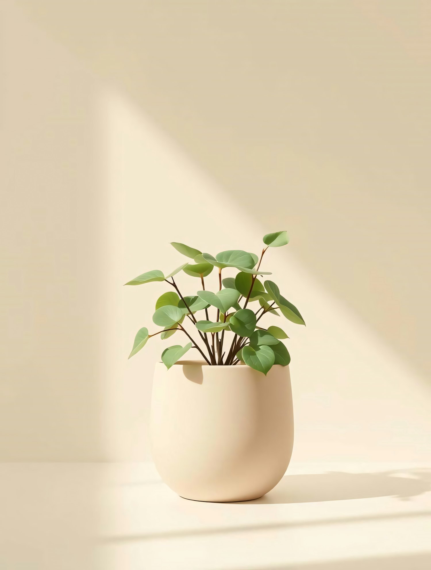 Minimalist potted plant with round green leaves in a cream ceramic pot, set against a soft beige background with natural light.